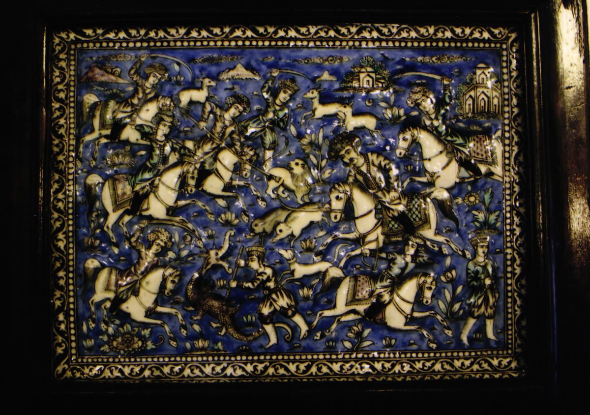 Descriere: Placă decorativă dreptunghiulară, încadrată de un chenar decorat cu vrej continuu și semipalmete, montată într-o ramă profilată de lemn. Compoziția decorativă, dispusă pe întreaga suprafață face referire la o scenă cinegetică, în care zece personaje (șapte călări și restul pe jos) înarmate cu săbii, arcuri sau sulițe vânează antilope, mistreți, un leu și un dragon. Prezența dragonului ar putea sugera o temă din epopeea Shah Name de Ferdousi, preluată dintr-o litografie. Scena se detașează pe un fond albastru cobalt, pe care apar motive florale supradimensionate și nori stilizați, într-o manieră ce amintește vag de arta chineză și de câteva arhitecturi. Cromatică: albastru cobalt, brun.