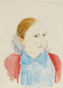 Descriere: Portret de fetiță redat din semiprofil dreapta, cu ochii mari, nasul cârn, părul prins în coadă la spate, poartă o haină roșie încheiată la gât.