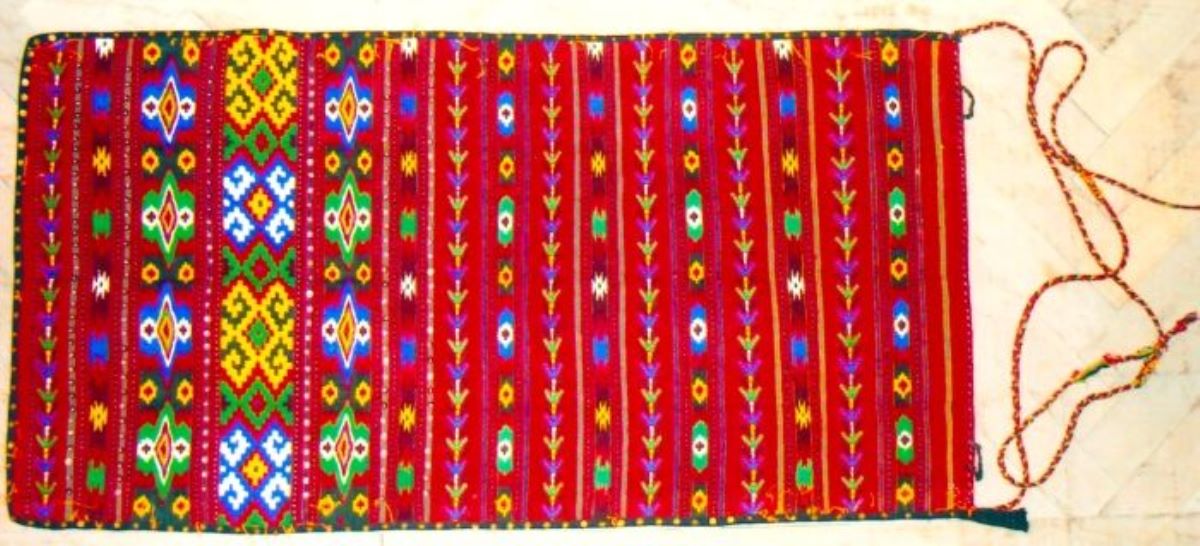 Descriere: Formă dreptunghiulară, decor geometrizant, amplasat pe toată suprafața, sub formă de registre orizontale, cu motivele „romb în trepte", cruce, în alternanță cromatică intercalate între vergi roșii mai late și vărguțe de culoare albastră, verde, negru. Partea inferioară are trei registre: unul central, cu motive geometrice: romb, mărginit de două registre cu vărguțe roșii, verzi și negre. Piesa prezintă pe trei laturi aplicație, panglică neagră și portocalie. Cromatică: roșu, albastru, verde, negru, alb, vișiniu.