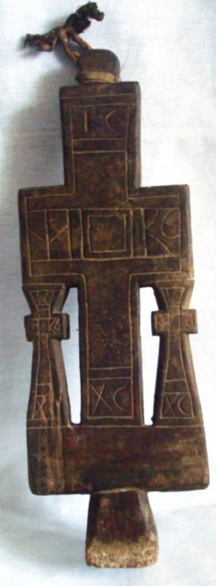 Descriere: Sigiliu de piatră sau lemn (în formă de cruce) cu care se împrimă pe prescuri semnul crucii și inițialele rituale; se punea pe perete. Piesă în formă de troiță cu o cruce centrală și două laterale sculptate dintr-o singură bucată de lemn și un suport la partea inferioară pe care sunt plasate însemnele rituale (partea cu care se imprimă pe colaci). Însemnele sunt trecute pe fiecare braț al crucii. Contururile piesei sunt marcate de linii drepte. Pe spate sunt trecute datarea și însemnele de meșter. Cromatica: maron – culoarea naturală a lemnului patinat.