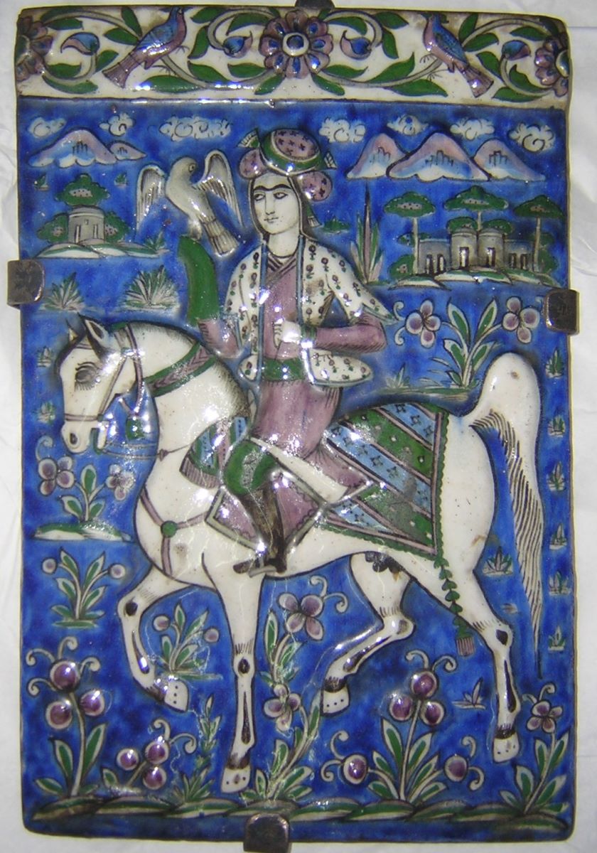 Descriere: Pe fond albastru cobalt, într-un peisaj cu flori, arhitecturi și munți, un călăreț pe cal alb, îndreptându-se spre stânga, cu un șoim pe mâna dreaptă, pe care poartă o mănușă verde. Sus, bandă decortivă (chenar) cu ramuri înfrunzite, flori și păsări pe fond alb. Culori: albastru, violet, negru, alb.