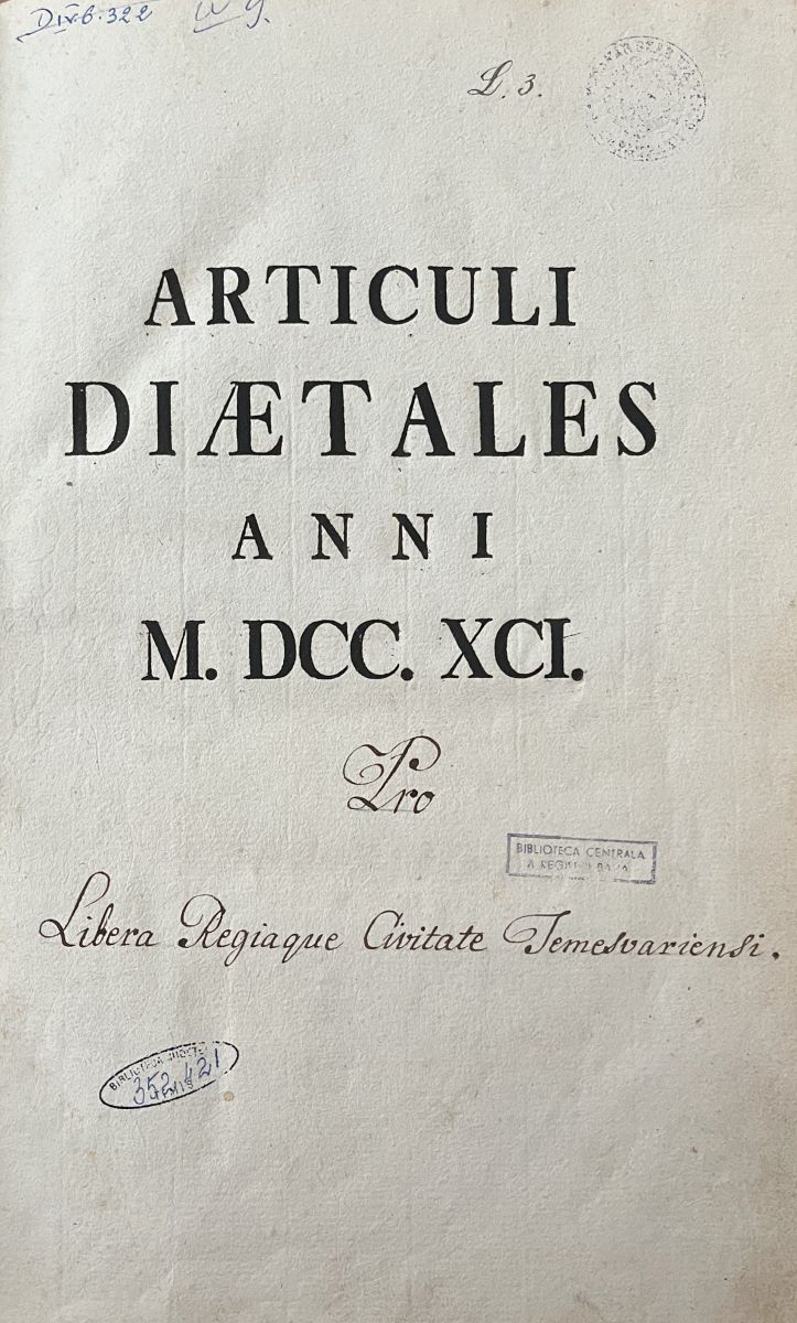 Descriere: Articuli Diaetales anni M. DCC. XCI. „Pro Libera Regiaque Civitate Temesvariensi” (adăugire manuscrisă)