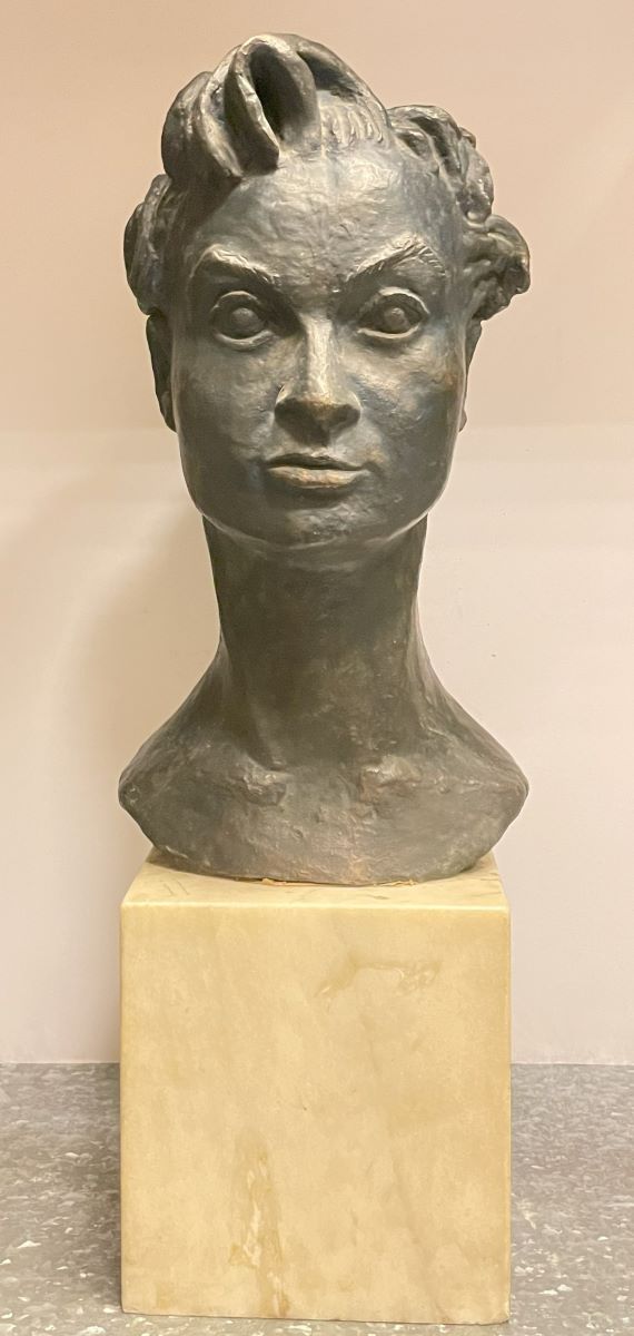 Descriere: Portret de tânără, redat frontal, într-o formă ușor stilizată dar totodată cu caracter realist, cu fizionomia robustă: ochi rotunzi, sprâncene arcuite, nas lat, buze subțiri, ușor strâmbe, cu părul așezat într-o parte și prins în coadă.