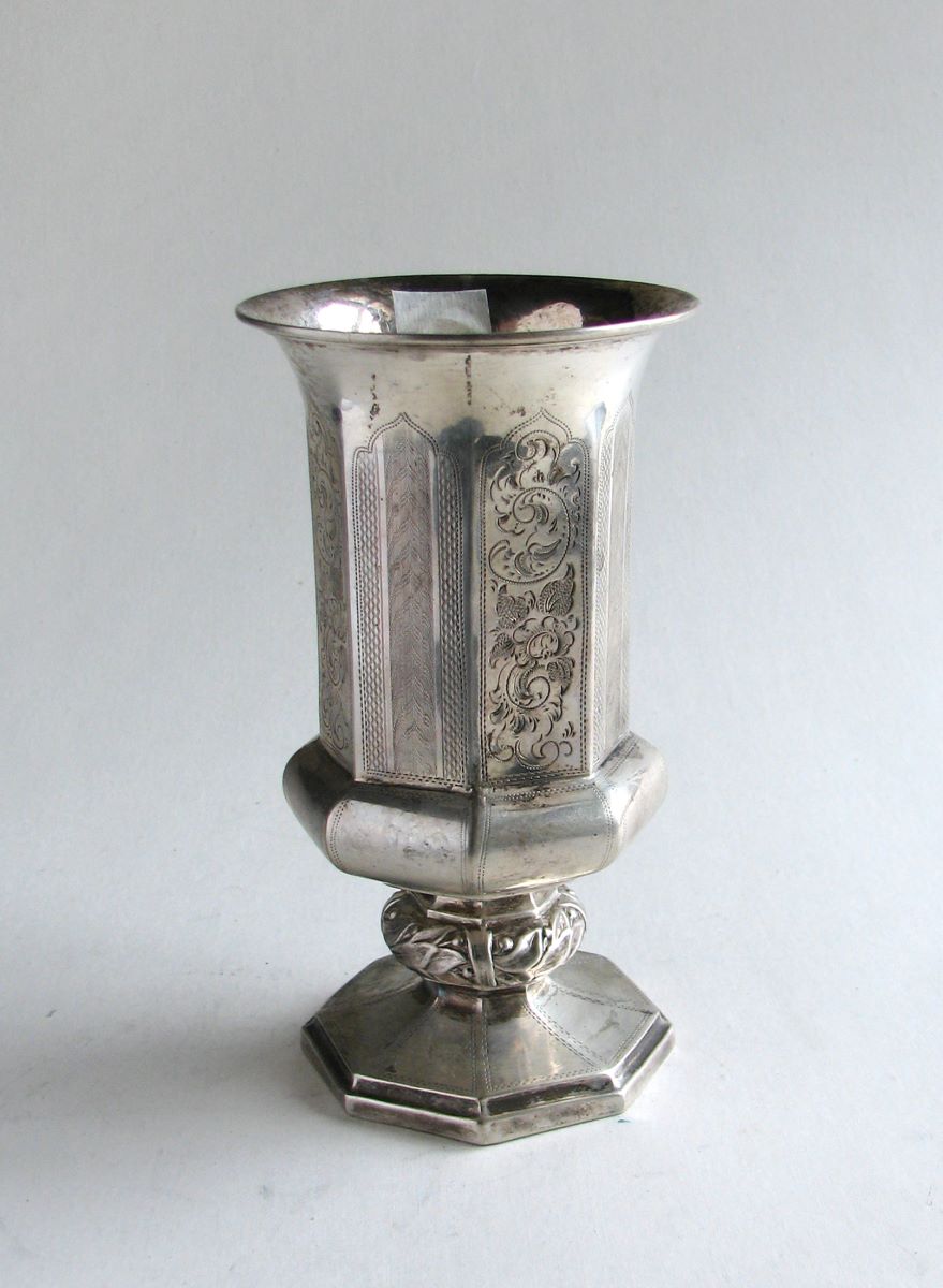 Descriere: Talpă și cupă octogonale; pe nodul sferic turtit se desfășoară o ghirlandă de frunze; motive decorative diverse (benzi verticale incizate cu rotița alternează cu brîuri vegetale stilizate).
