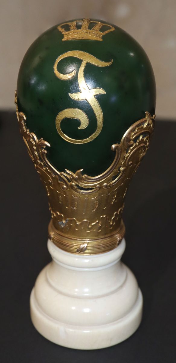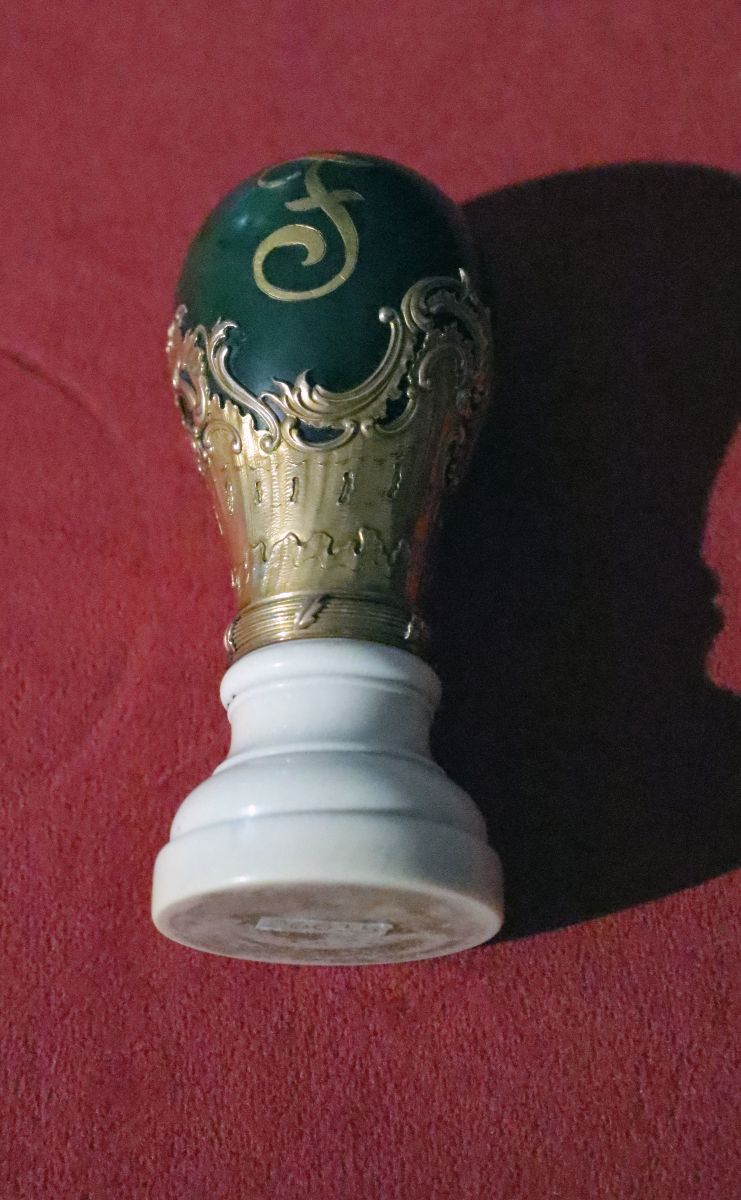 Descriere: Este format din două părți: mânerul sigiliului și suportul propriu-zis. Mânerul care se înșurubează în suport este de jad, are ornamente aplicate de aur și înscrustații de aur ce reprezintă o coroană regală și litera „F”. Suportul propriu-zis este din fildeș. Inscripții: Pe mâner litera „F”.A aparținut lui Ferdinand I Regele României.