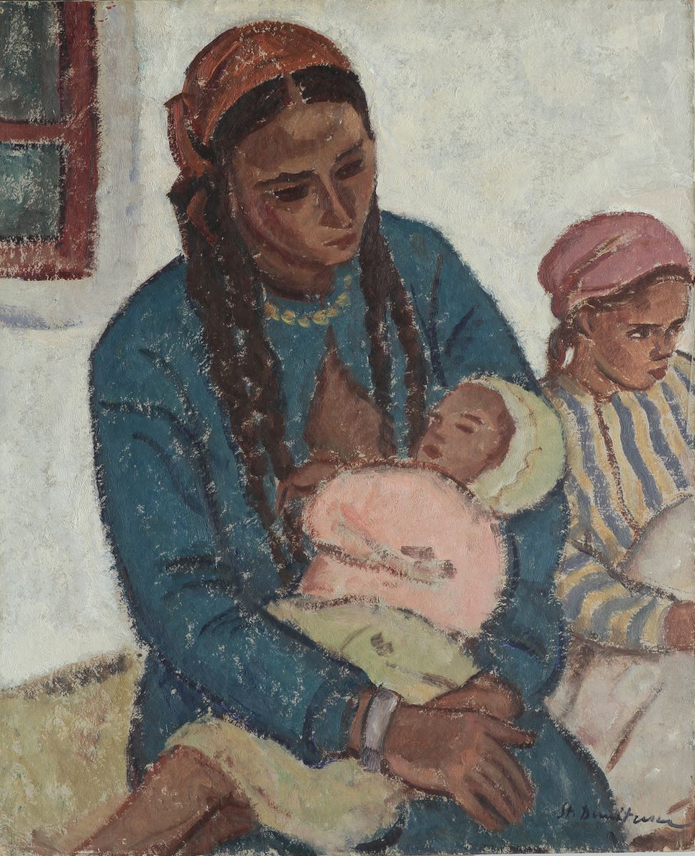 Descriere: Compoziție cu o femeie cu doi copii, în fața unei case. În prim-plan, femeia așezată, redată trei sferturi, în semi-profil spre dreapta, ține în brațe un copil mic. Mama este îmbrăcată într-o rochie lungă, albastră, purtând un batic reprezentat în tonuri de maro de nuanțe care variază de la maro deschis până la maro închis. De sub batic se întrevede părul de culoare închisă, cu cărare pe mijloc. Din dreapta și din stânga feței, se disting câte două cozi împletite, lungi până înspre zona taliei. Carnația femeii este redată în nuanțe de brun. Femeia privește înspre copilul care-i doarme în poală. Lângă mamă, în dreapta compoziției, se află o fetiță așezată, purtând un batic în nuanțe deschise de roșu și o bluză cu dungi albastre și galbene. În spatele lor, o casă în gri deschis. În stânga sus se vede parțial o fereastră. Construcția fermă a compoziției este evidențiată și de utilizarea unor culori saturate, abordând game închise, aflate într-un contrast puternic cu suprafețele mai puternic iluminate ale compoziției. Cromatică în tonuri de albastru, brun și ocru, alburi și griuri colorate. Semnat dreapta jos, cu gri închis: St. Dimitrescu. Nedatat.