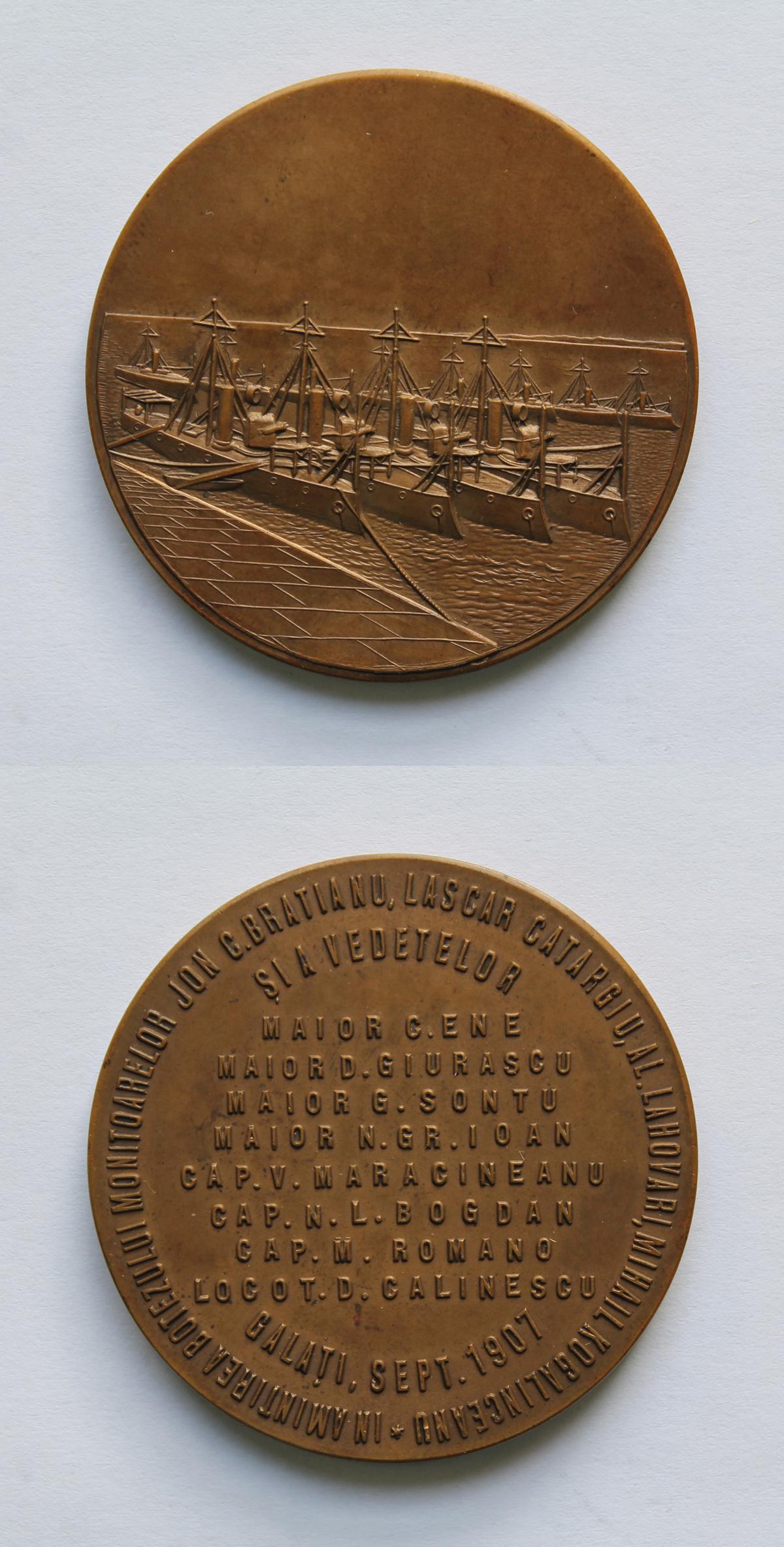 Legendă revers: IN AMINTIREA BOTEZULUI MONITOARELOR JON C. BRATIANU, LASCAR CATARGIU, AL. LAHOVARI, MIHAIL KOGĂLNICEANU * - ȘI A VEDETELOR / MAIOR C. ENE / MAIOR D. GIURASCU / MAIOR G. SONTU / MAIOR N. GR. IOAN / CAP. V. MARACINEANU / CAP. N. L. BOGDAN / CAP. M. ROMANO / LOCOT. D. CALINESCU / GALAȚI, SEPT. 1907