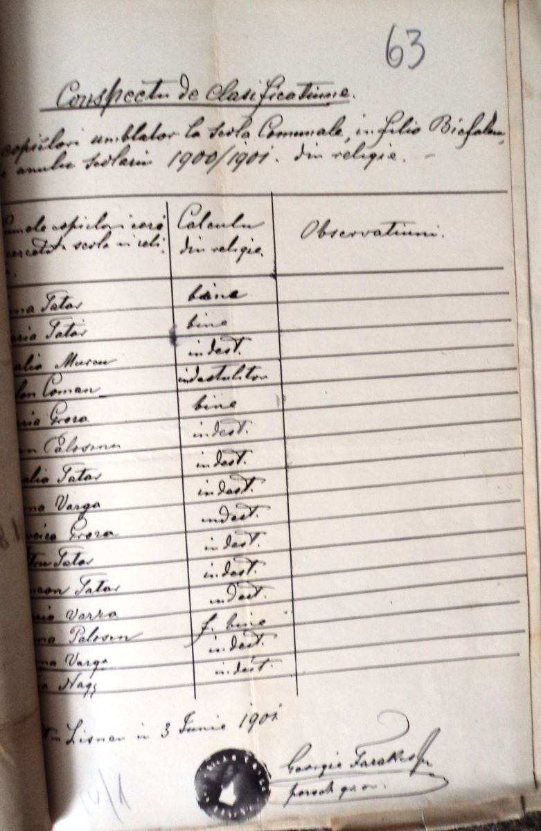 Titlu: Conspect referitor la calificativul obținut la religie, în anului școlar 1900/1901, de către elevii ortodocși înscriși la școala comunală din filia Bicfalău