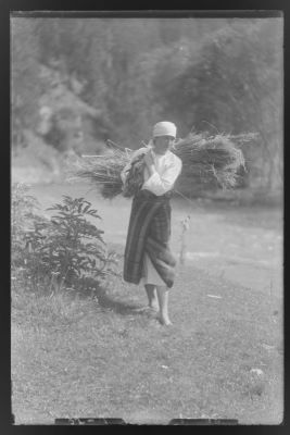 Descriere: Clișeul suprinde o femeie îmbrăcată în port popular, având cămașă albă, poale albe, catrință încinsă cu bete, basma pe cap și desculță, care cară în spate mai multe mănunchiuri de cânepă ce urmează să fie topită. În dreapta femeii se văd niște buruieni, iar în stânga este un curs de apă.