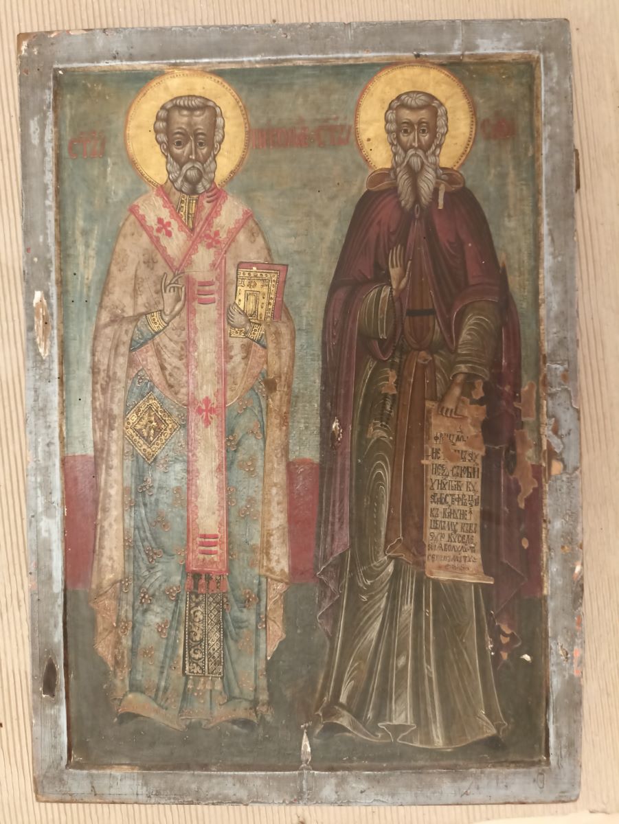 Descriere: Reprezentați figură întreagă, Sf. Nicolae în veșminte arhierești, cu Evanghelia închisă în stânga și binecuvântând cu dreapta, iar Sf. Sava în veșminte de monah, cu o filacteră desfășurată în stânga și binecuvântând cu dreapta. Fundal tricolor: albastru în jumătatea superioară, roșu și verde în jumătatea inferioară.