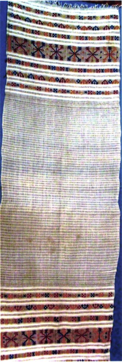 Descriere: Formă dreptunghiulară, ornamentată pe toată suprafața cu motive geometrice diverse dispuse la capete sub forma unui registru mai lat, mărginit de câte trei registre mai înguste în alternanță cromatică: cruce în X, romb, vargă, intercalate cu grupuri de câte două vergi înguste din fir metalic. Mijlocul este ornamentat cu vărguțe țesute din bumbac în alternanță cu vărguțe din fir metalic dispuse orizontal. Capetele se termină cu firele libere ale urzelii. Cromatică: alb, roșu, galben, albastru, piersiciu.