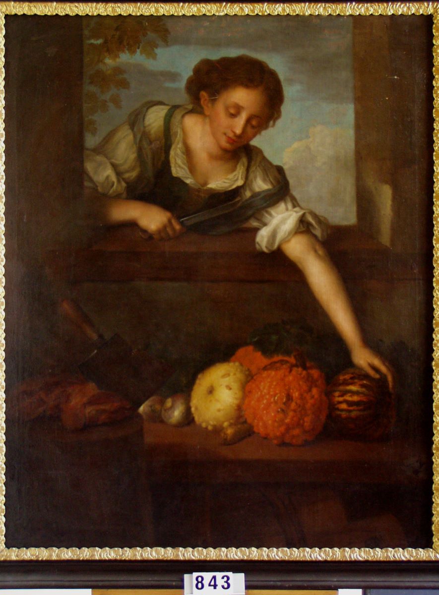 Descriere: O fată îmbrăcată cu cămașă albă și rochie verde și cu un voal albăstrui-cenușiu peste umeri, care ține în mâna dreaptă sprijinită pe pervaz un cuțit de bucătărie, se apleacă pe fereastra unei case țărănești spre a lua un pepene galben de pe o bancă aflată în interior. Pe aceeași bancă se mai află 3 dovleci, o rădăcină de pătrunjel, doi napi și verdeață. Sub bancă se află o cofă din lemn, marcată pe toartă (chiar lângă gaură) cu semnul + și cu un punct. În stânga se găsește un butuc de tăiere, cu un satâr înfipt în el, lângă două bucăți mari de carne crudă. Prin fereastră se zăresc în stânga câteva ramuri din coroana unui arțar și un petec de cer, acoperit cu nori cenușii și albi. Personajul, dar mai ales legumele, sunt scoase în evidență prin ecleraj și efecte cromatice. Structura compozțiiei și eclerajul mai puternic în planurile mai apropiate creeză și iluzia perspectivei, a unei distanțări față de privitor. Compoziție bine structurată, echilibrată cromatic, în tonuri calde de brun și cenușiu, cu accente de oranj și galben și mai reci, de albastru și verde.