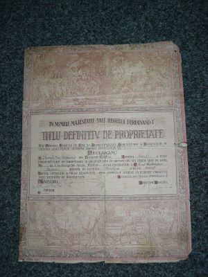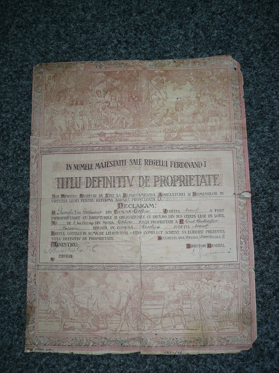 Descriere: Emis și semnat în numele Majestății Sale Regelui Ferdinand, de către ministrul secretar de stat la Ministerul Agriculturii și Domeniilor, Alexandru C. Constantinescu, în baza reformei agrare promulgată la 17 iulie 1921, titlul atestă împroprietărirea lui Gheorghe Vas. Berbecariu din comuna Costișa, județul Neamț cu o suprafață de 4 ha, 5000 mp din moșia Costișa, fosta proprietate a lui Constantin Cantacuzino Pașcanu. Se specifica și prețul lotului în valoare de 6642 bani. Are numărul de ordine 220949. Textul amplasat la mijlocul documentului este încadrat în registrul de sus (central este amplasată stema regatului României) și de jos de scene alegorice, sugerând împroprietărirea, reproduceri după o lucrare a pictorului Arthur Verona, al cărui nume îl regăsim în colțul din stânga jos.