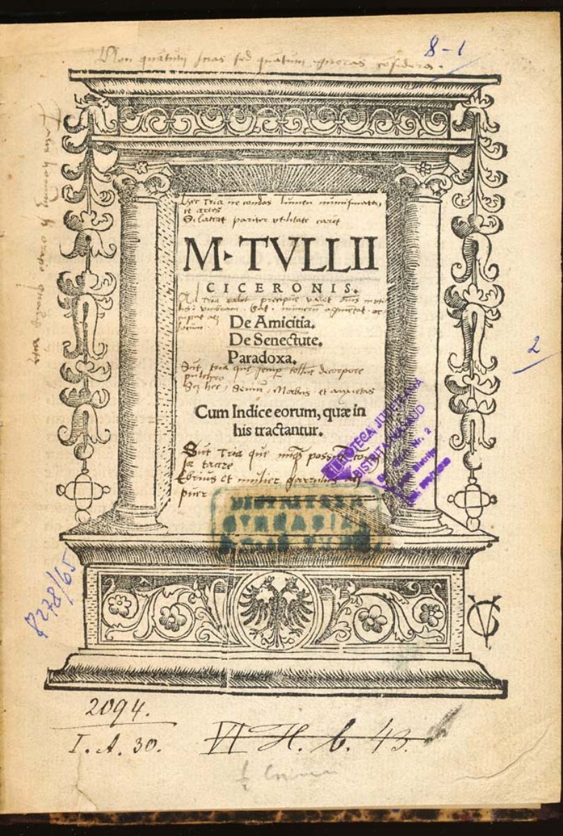 Titlu: M. Tulii // Ciceronis // De Amicitia. // De Senectute. // Paradoxa. // Cum Indice eorum, quae in // his tractantur. //