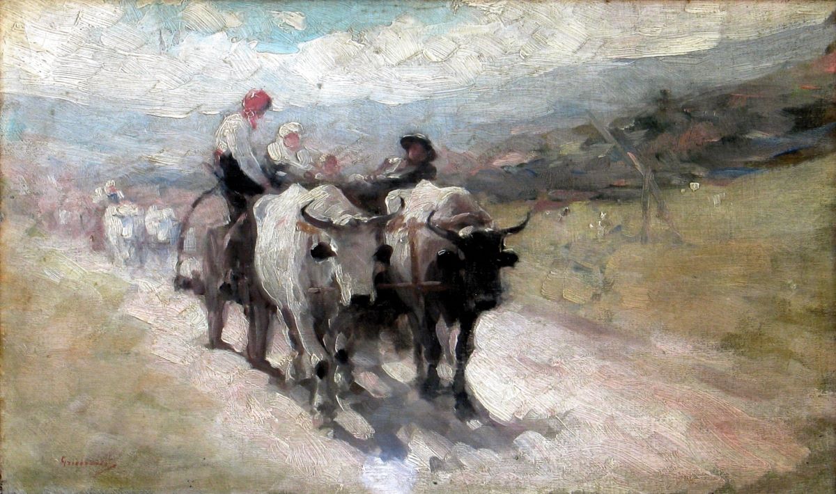 Descriere: Pe un drum de țară prăfuit înaintează mai multe care cu boi, văzute din față. În prim-plan un car în care se află un țăran cu pălărie, două țărănci cu marame albe și o țărancă cu basma roșie așezată pe marginea căruței. În stânga, o fântână cu cumpănă. În fundal, mai multe care abia schițate. Cer albastru cu nori. Colorit pastelat. Predomină albul. Pensulație spontană cu trăsături largi de penel.