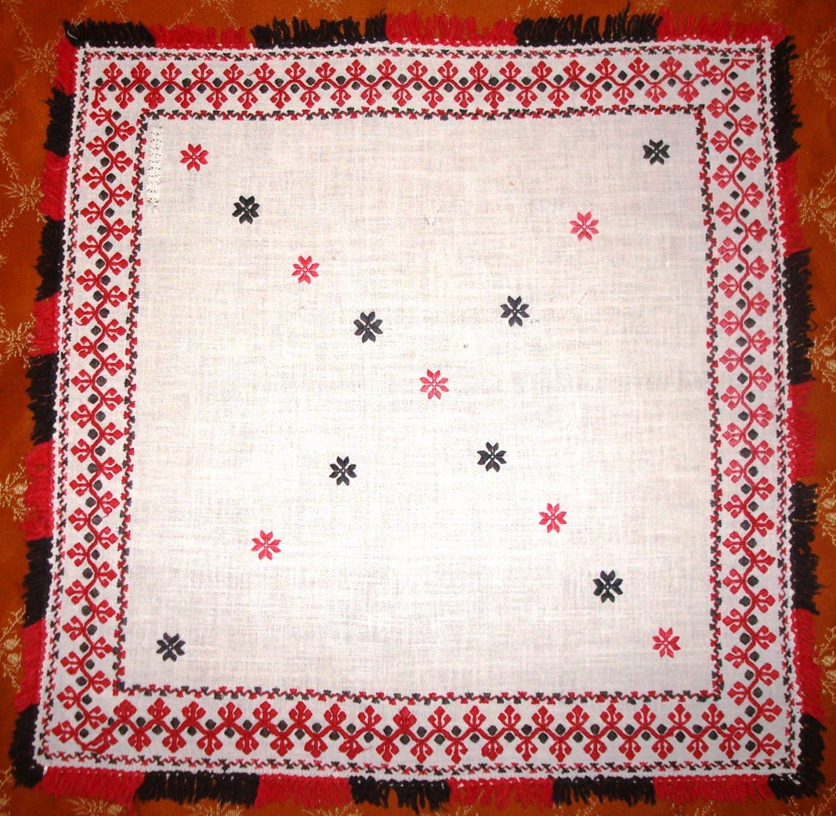Descriere: Formă pătrată, cu decorul amplasat la margine, sub forma unui chenar, cu motive florale stilizate. Câmpul central este decorat cu motivul „cruce în X”, realizată cu motive astrale, dispuse în altenanță cromatică. Marginile au aplicație de ciucuri înnodați, dispuși în alternanță cromatică. Cromatică: alb, roșu, negru.