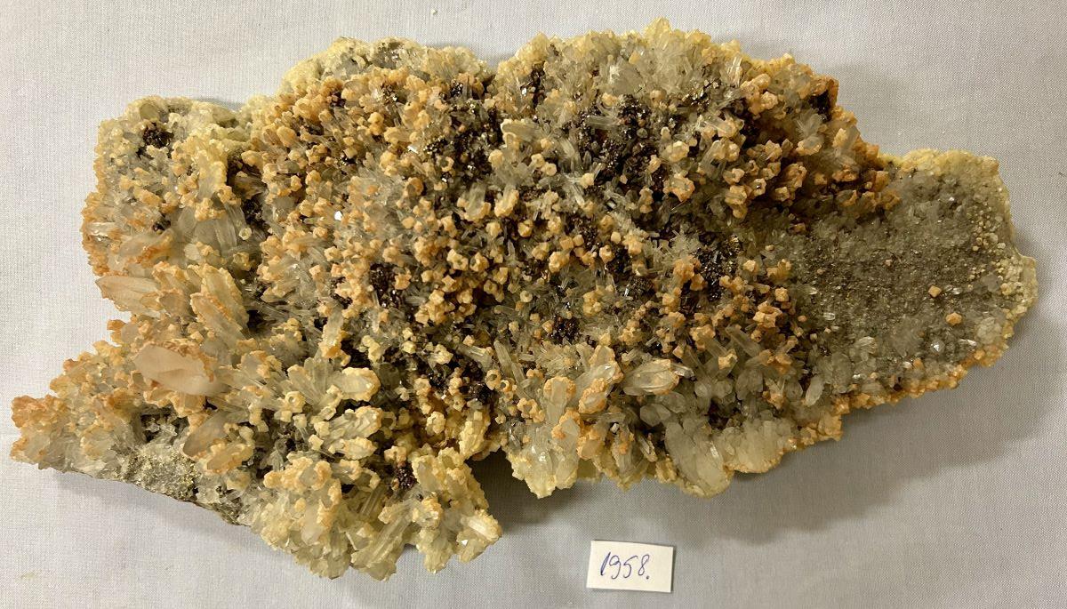 Descriere: Placă subțire de cuarț milimetric, cu apariții de cristale centimetrice, transparente, cu vârfuri intacte și luciu metalic puternic. Acestea apar în parageneză cu cristale milimetrice de calcopirită, culoare proaspătă aurie, luciu metalic puternic. Pe spate, eșantionul este în întregime acoperit de cristale milimetrice romboedrice de calcit (culoare galbenă). Pe față apar romboedri milimetrici, perfecți, de calcit galben, mat, presărați pe cristalele de cuarț. Combinația celor trei specii minerale, contrastul de luciu și culoare, oferă aspectul estetic deosebit.