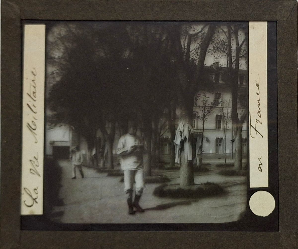 Descriere: Diapozitiv ce conține o imagine alb-negru, stocată pe suport de sticlă, care ilustrează doi militari aflați în curtea unei școli militare sau a unei cazarme. Cel aflat în prim-plan este în mers și citește. Pe clișeu, în partea dreaptă și, repectov, stânga, este lipită câte o bandă de hârtie albă ce conține înscrisul în limba franceză, de mână, a temei imaginii: ”La vie militaire en France”. Diapozitivul este protejat pe cele patru laturi de o bandă îngustă de hârtie neagră. Pentru vizualizarea diapozitivului se utiliza lanterna magică, primul proiector de imagini statice. Diapozitivul provine dintr-un atelier fotografic din Franța, dar nu se specifică acest aspect prin alte înscrisuri. Stare bună de conservare.