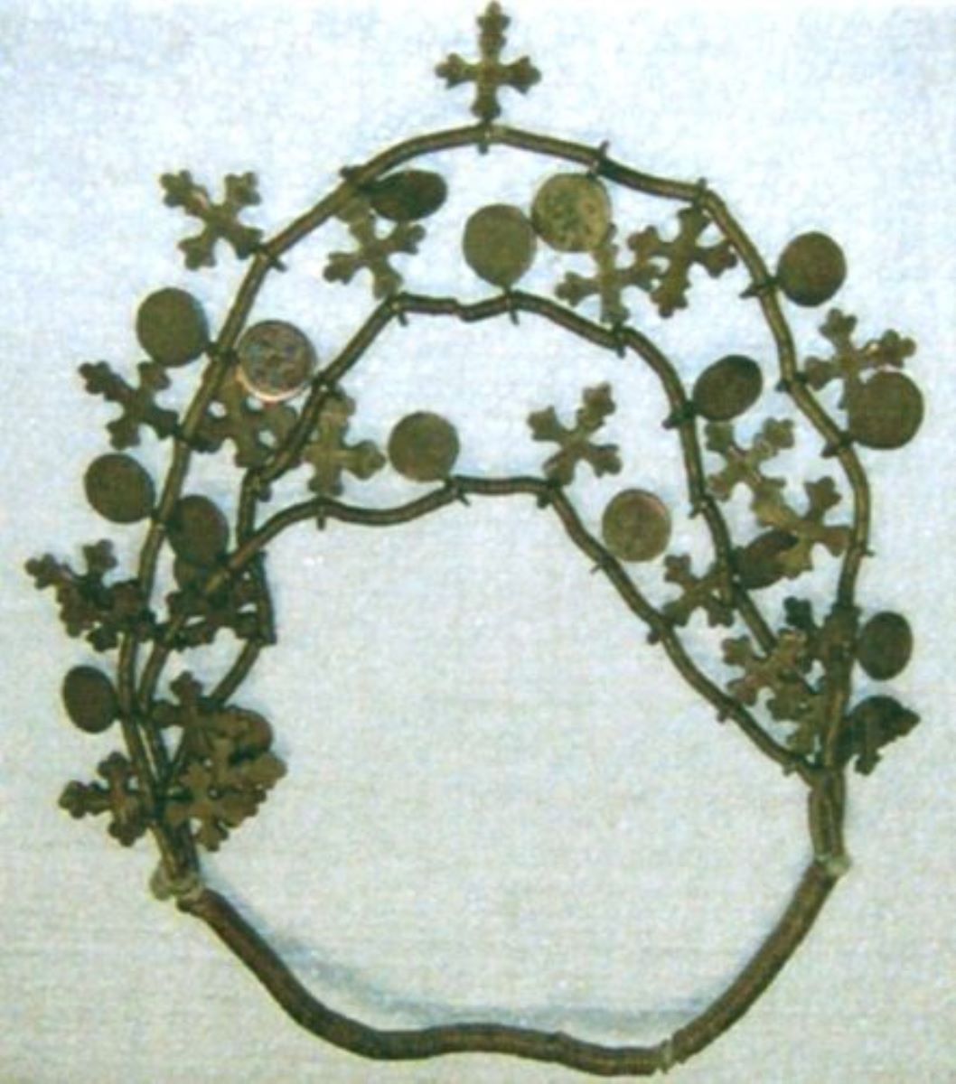 Descriere: Salbă cu trei rânduri de cruci pe care sunt așezate 24 de cruci și 18 discuri mici; cu motive geometrice: cruce, cerc, lanț rotund; culoarea metalului cu patină.