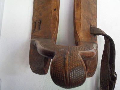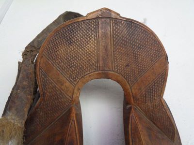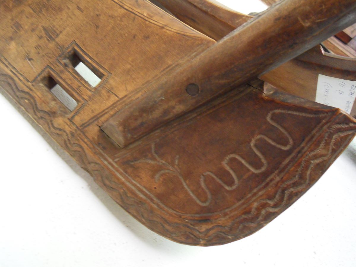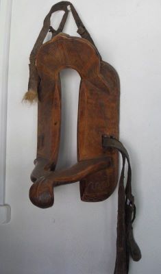 Descriere: Șa din lemn; prezintă două găuri pe laterale prin care este trecută cureaua (din piele) ce servește la fixarea șeii pe cal și prezintă două inele metalice de care se prindeau poverile. Pe întreg corpul obiectului se găsesc ornamente cu motive geometrice și vegetale stilizate (liniare, curbilinii, zig-zaguri, dinți de ferăstrău, rețea de romburi) sculptate cu dalta. Partea centrală este decupată longitudinal; extremitățile rotunjite și arcuite în partea superioară. Cromatica: lemn, curea maron, metal negru.