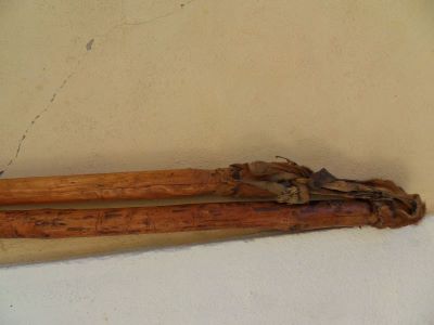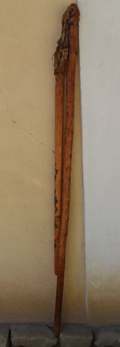Material/Tehnică (text): Două prăjini: una lungă, cu funcția de mâner și cealaltă scurtă, cu funcția activă; ambele sunt decojite și cioplite și fiecare are la un capăt scobituri circulare în care se prind fâșii din piele care face legătura între ele.