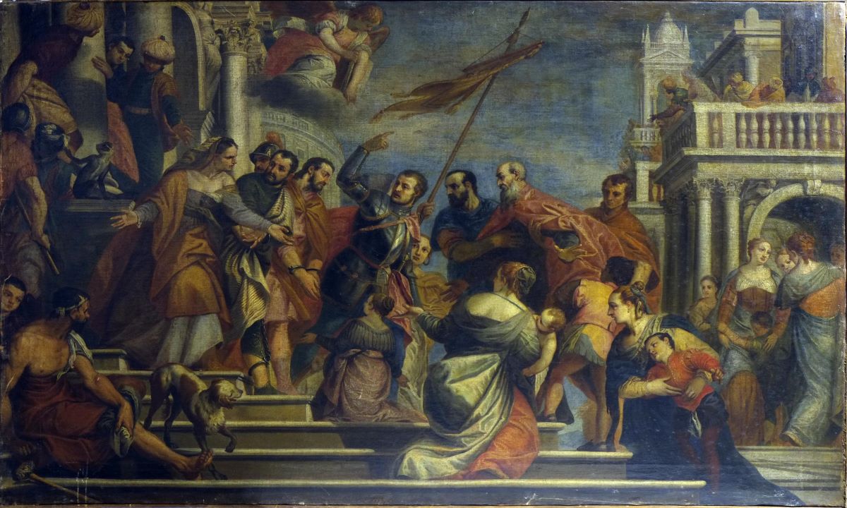 Descriere: În tablou este reprezentată scena martirizării sfinților diaconi Marcu și Marcelin, doi frați gemeni din Roma, eveniment survenit în anul 286 d. Hr., la ordinul împăratului Dioclețian. Sursa hagiografică a acestei istorii este „Legenda Aurea”, scrisă de Jacopo da Voragine în secolul al XIII-lea. Potrivit acestui autor, cei doi frați refuză să-și abjure credința, fiind susținuți – în drumul spre locul martirajului – de sfântul Sebastian. Vizualizată într-o perspectivă ascendentă, mulțimea personajelor se mișcă dinspre stânga spre dreapta. Cei doi protagoniști, încătușați laolaltă, sunt conduși de un reprezentant al autorității figurat anacronic, într-o armură modernă, fiind întâmpinați de numeroase personaje – femei cu copii, un bătrân cu aparența unui doge (posibil, tatăl celor doi martiri), mai mulți „orientali” cu aparența unor turci otomani (aluzie, probabil, la amenințarea Creștinătății), cerșetori, animale (o maimuță și un câine etc.). Paolo Veronese compune această scenă cu un sesizant efect cinematic, comasând numeroase personaje într-o scenografie spectaculoasă, inspirată de edificiile construite, la Veneția, de Sebastiano Serlio și Andrea Palladio în chiar epoca în care este pictat tabloul prototip.