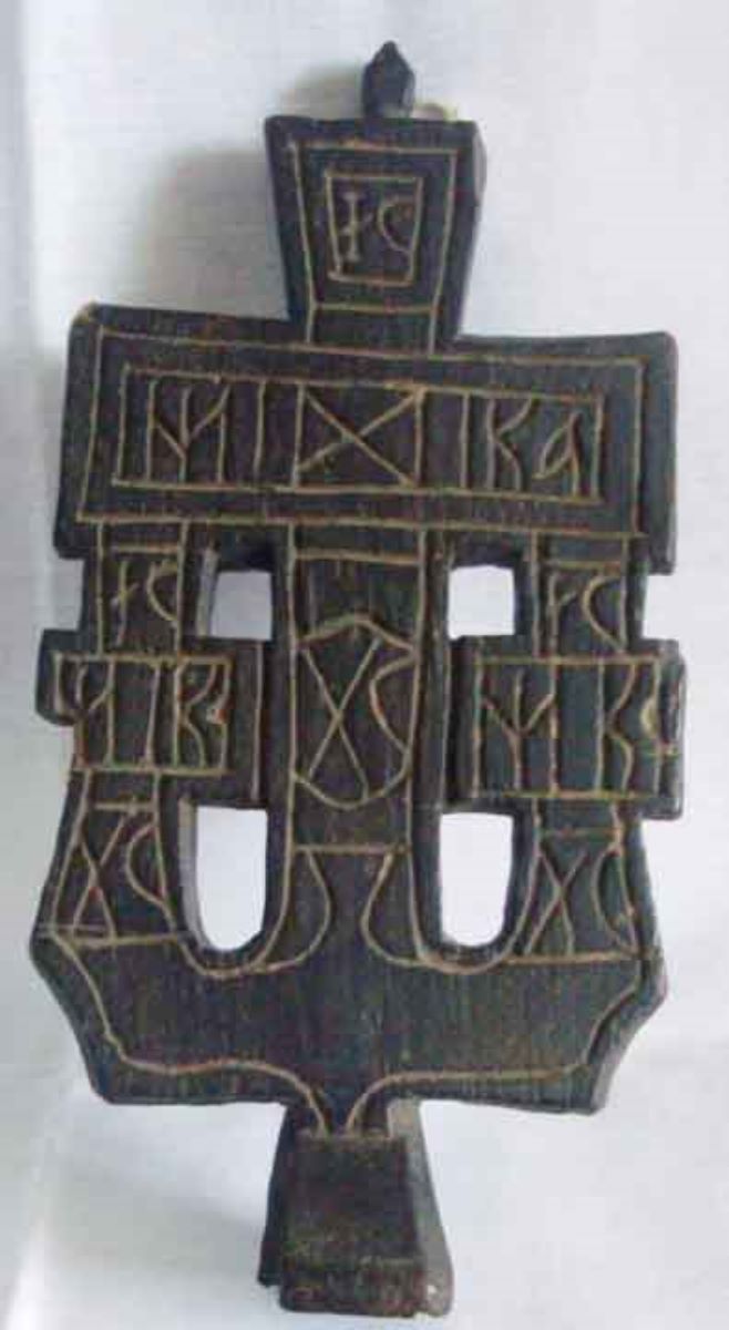 Descriere: Sigiliu de piatră sau lemn (în formă de cruce) cu care se imprimă pe prescuri semnul crucii și inițialele rituale; se punea pe perete. Piesă în formă de troiță cu o cruce centrală și două laterale sculptate dintr-o singură bucată de lemn și un suport la partea inferioară pe care sunt plasate însemnele rituale (partea cu care se imprimă pe colaci). Însemnele sunt trecute pe fiecare braț al crucii. Contururile piesei sunt marcate de linii drepte. Cromatica: negru gălbui – culoarea naturală a lemnului patinat.