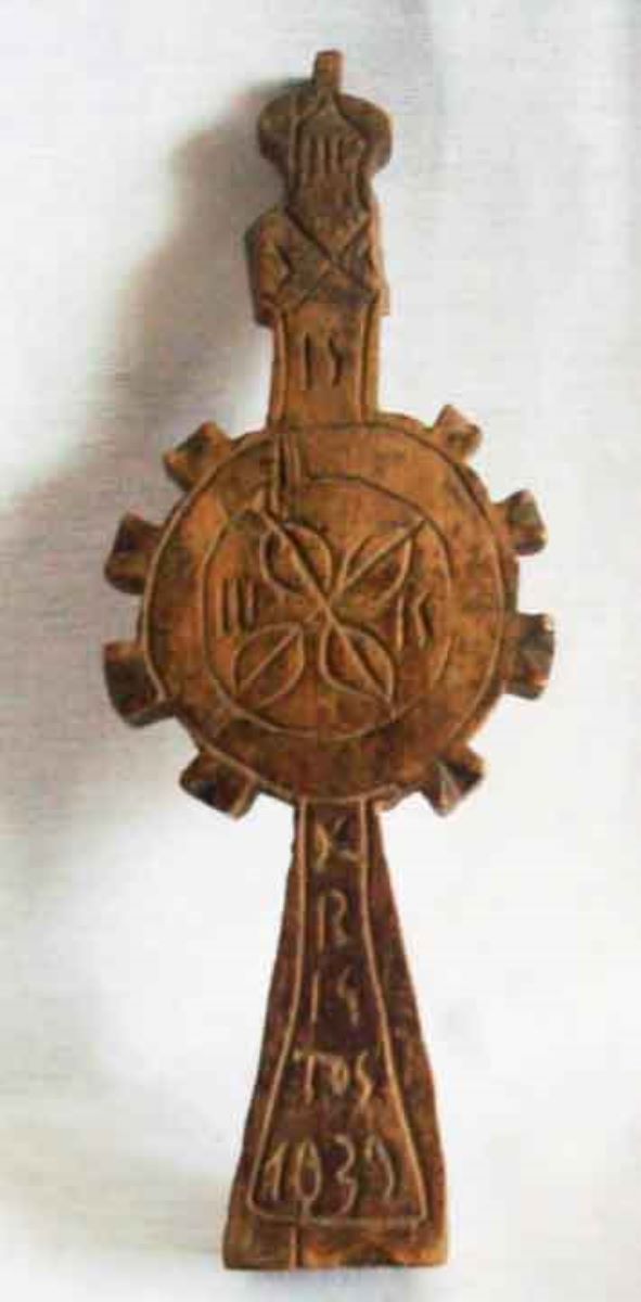 Descriere: Sigiliu de piatră sau lemn (în formă de cruce) cu care se împrimă pe prescuri semnul crucii și inițialele rituale; se punea pe perete. Piesă în formă de cruce cu partea centrală rotundă cu opt raze sculptate dintr-o singură bucată de lemn. Partea rotundă este decorată cu motive geometrice – cercuri concentrice, cruce în x – și fitomorfe – patru frunze dispuse în cruce în x. Contururile piesei sunt marcate de linii drepte. Cromatica: negru-gălbui – culoarea naturală a lemnului patinat.