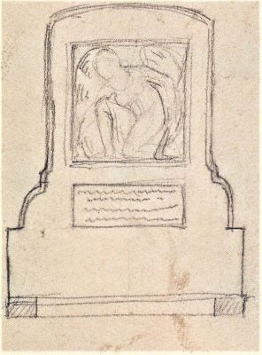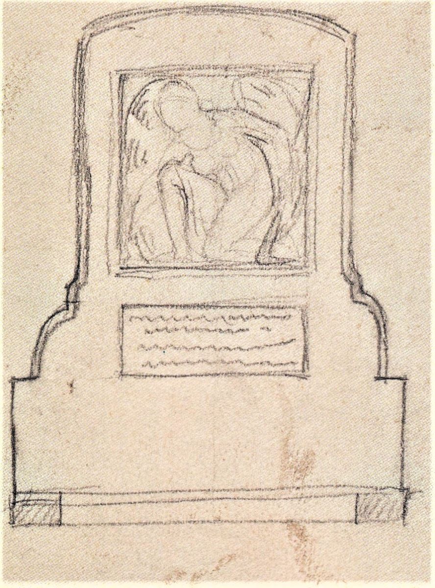 Descriere: Studiu de monument funerar, probabil protestant. Pe un panou masiv sunt figurați la partea superioară un înger îngenuncheat, înscris într-un pătrat și la partea inferioară un cartuș dreptunghiular, pentru text. Desen sintetic, liniar, cu duct modulat caligrafic.