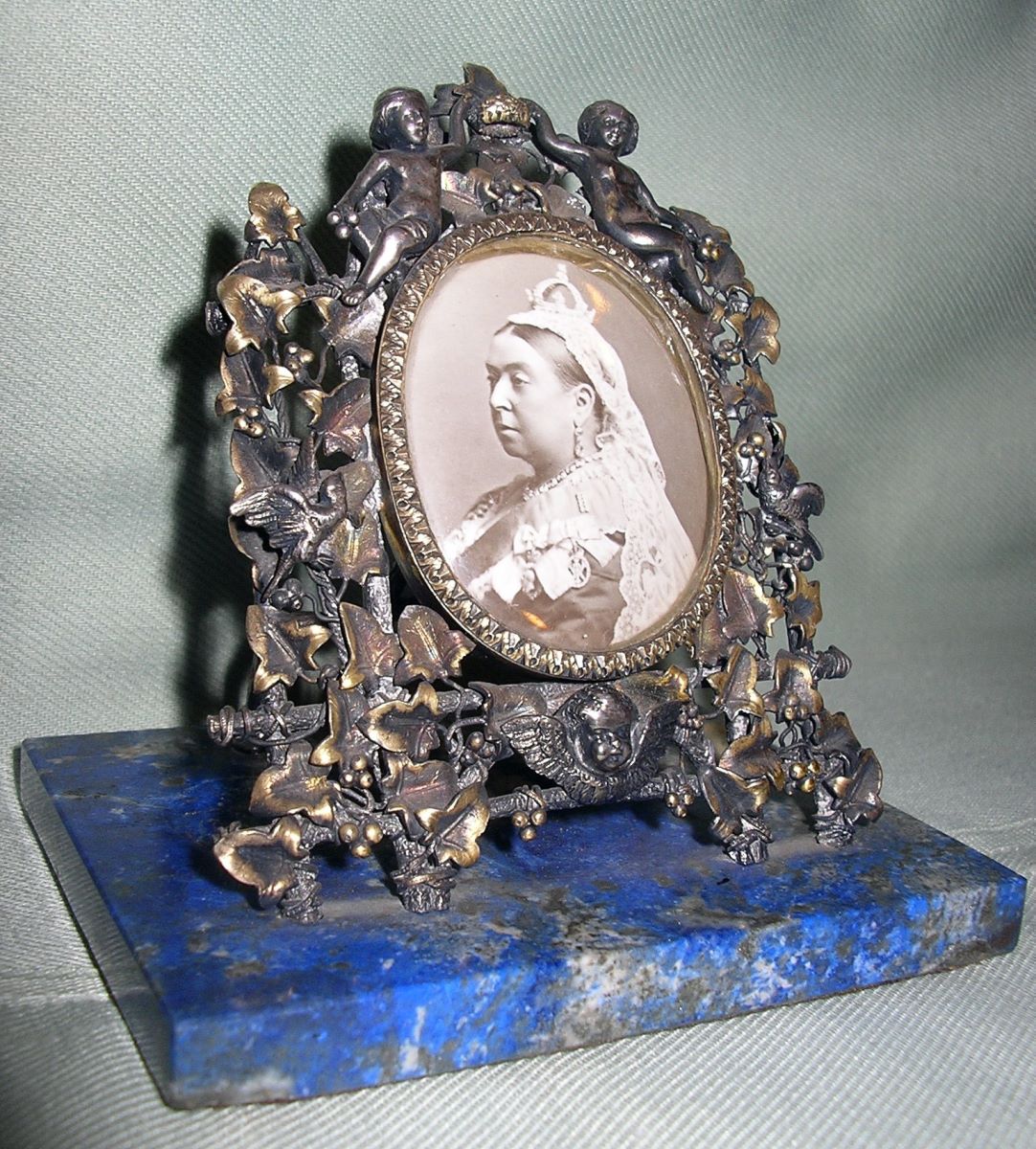 Descriere: Fotografie reprezentând bustul reginei Victoria a Regatului Unit al Marii Britanii și Irlandei, Împărăteasa Indiei, semiprofil stânga, încoronată, în medalion oval cu brodura din argint cu decor palmete; medalionul este încadrat în rama lată cu schelet din trei ogive, sprijinită pe patru picioare araci, cu decor frunze de viță de vie și struguri, inferior heruvim, lateral două păsări, superior doi putti adosați, susținând cunună aurită; rama cu picior de susținere (doi araci) este fixată oblic pe postament dreptunghiular din lapislazuli; pe talpă, material textil de protecție din catifea vișiniu închis. Fotografia a fost realizată de Alexander Bassano, în anul 1882, cu ocazia nunții ducelui și ducesei de Albany.