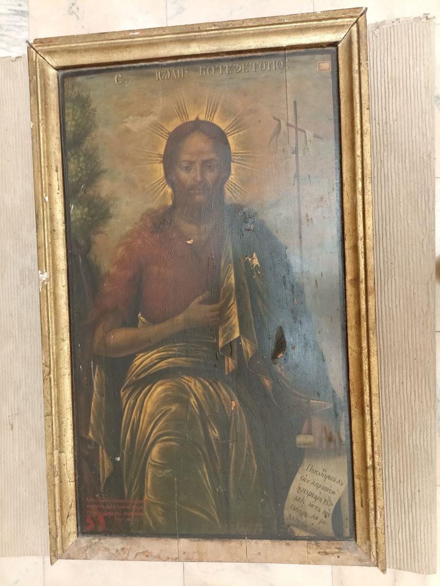 Descriere: Sfântul Ioan este redat trei-sferturi, purtând veșmântul din blană și mantia înfășurată în jurul mijlocului, cu un colț adus peste umărul stâng. În mâna stângă ține o cruce cu o hampă lungă și un filacter desfășurat, iar mâna dreaptă este adusă în dreptul pieptului. Modul de tratare a fizionomiei și a peisajului indică un iconar bine familiarizat cu arta icoanei rusești.