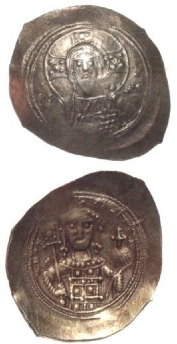 Descriere revers: Bust frontal Mihail VII cu barbă; poartă stemma, este îmbrăcat cu clapotos loros și maniakion; în mâna dreaptă ține un labarum, iar în mâna stângă ține un glob cruciger.