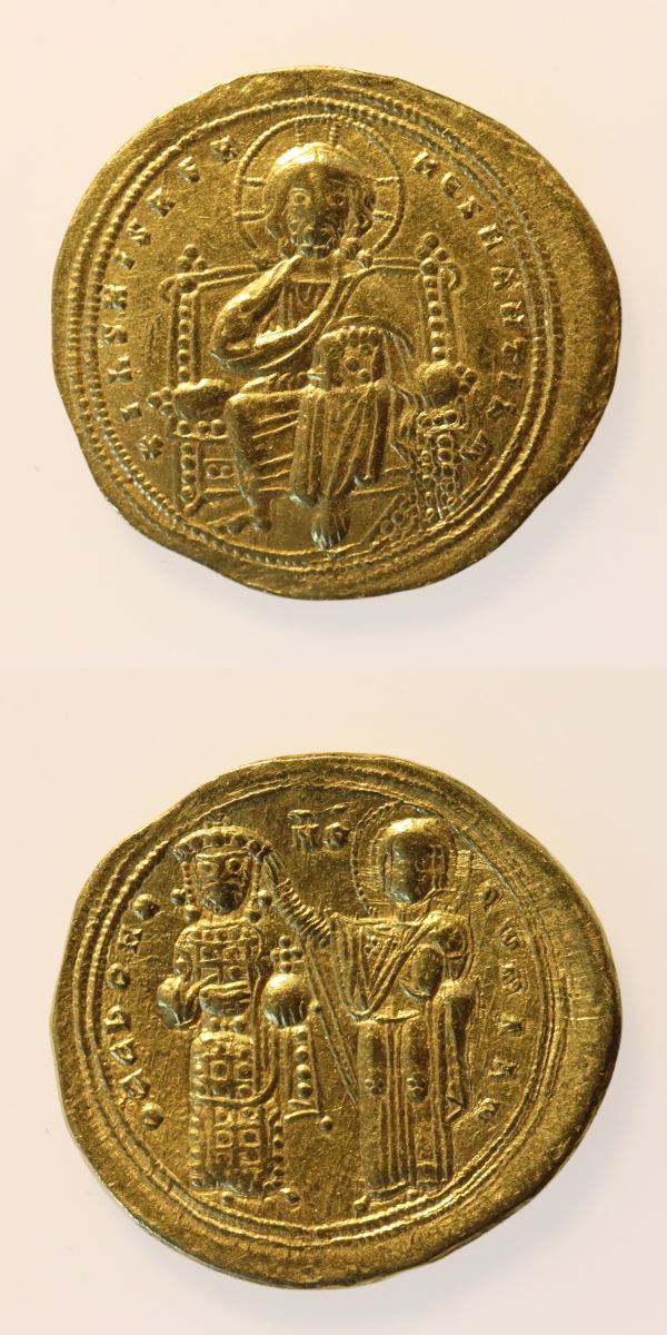 Descriere revers: Legendă dispusă circular pe margine. Roman reprezentat în picioare, frontal, în stânga, având mâna dreaptă pe piept și în mâna stângâ ținând un glob cruciger. În dreapta, Fecioara Maria (Theotokos) reprezentată în picioare, frontal, îl încoronează și binecuvântează pe Roman. Cerc perlat exterior dublu.
