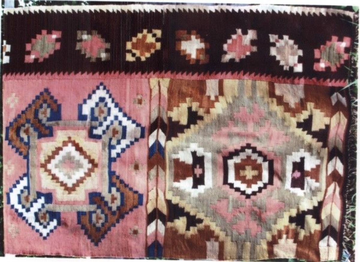 Descriere: De formă dreptunghiulară, dintr-o singură foaie, decor amplasat pe toată suprafața cu motive decorative diverse dispuse în două registre: unul mai lat cu romburi concentrice dințate, pătrate, cruce dreaptă, în alternanță cromatică, separat în registre mai mici de patru vergi cu motivul „furcă” și unul mai îngust cu motive fitomorfe (frunză) pe un fond cafeniu. Registrul mai îngust este mărginit de „dinți de fierăstrău”. La capete, ciucuri din urzeala înnodată. Cromatică: cafeniu închis, cafeniu deschis, alb, galben, albastru, piersiciu.