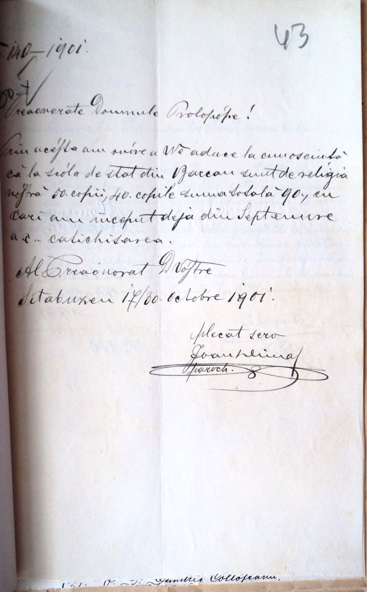 Descriere: Preotul Ioan Dima comunică protopopului că, deja din septembrie, s-a început catehizarea cu cei 90 de elevi români (50 de băieți și 40 de fete) de religie ortodoxă care sunt înscriși la școala de stat austro-ungară din Sita Buzăului; documentul este autentificat cu semnătura autografă a preotului paroh Ioan Dima.