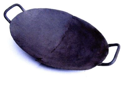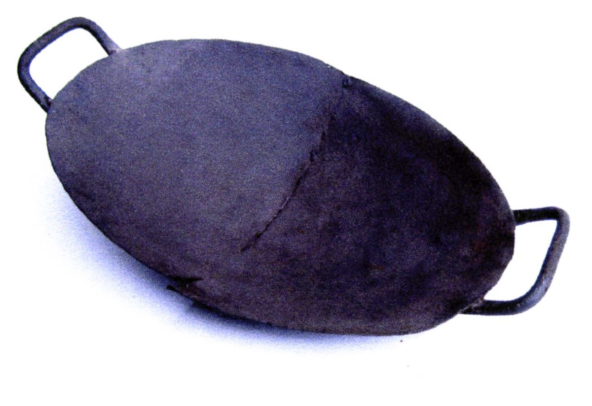 Material/Tehnică (text): trocul este confecționat din tablă de oțel prin forjare și nituire