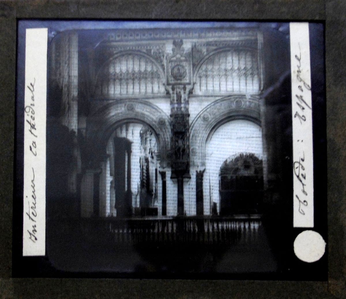 Descriere: Diapozitiv ce conține o imagine alb-negru, stocată pe suport de sticlă, care ilustrează o parte din interiorul catedralei romano-catolice, în stil gotic, aflată în orașul Toledo din Spania. Pe suportul de sticlă, în partea dreaptă și stânga, este lipită câte o bandă de hârtie albă ce conține înscrisul în limba franceză, olograf, a temei imaginii: ”Interieur Cathédrale Tolède: Espagne”. Diapozitivul este protejat pe cele patru laturi de o bandă neagră de hârtie. Pentru vizualizarea diapozitivului se utiliza lanterna magică, primul proiector de imagini statice. Diapozitivul provine dintr-un atelier fotografic din Franța, dar nu se specifică acest aspect prin alte înscrisuri. Stare bună de conservare.