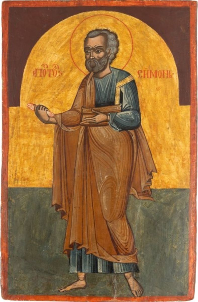 Descriere: Icoana a făcut parte din friza Apostolilor dintr-un iconostas brâncovenesc. Pe fondul ocru-galben din partea superioară și verde din partea inferioară a icoanei, sub un arc cintrat, este redat Apostolul Simon, în picioare, orientat spre stânga. În mâna dreaptă ține un rotulus, iar cu stânga îl indică. Este reprezentat conform iconografiei tradiționale, cu părul și barba albe. Poartă un chiton albastru și un himation cafeniu deschis, cutele unghiulare ale veșmântului fiind redate în nuanțe mai închise sau mai deschise, din aceeași culoare, pentru umbre sau lumini. Trăsăturile chipului Apostolului Simon sunt realizate în conformitate cu tipologia specifică stilului brâncovenesc, modeleul fiind redat într-o nuanțată gamă de ocruri, cu treceri gradate de la zonele de umbră la cele de lumină. Aureola din jurul capului este delimitată de o linie roșie față de fondul ocru-galben al icoanei. Inscripțiile de desemnare a personajului sunt executate cu litere roșii, chirilice, în limba română.