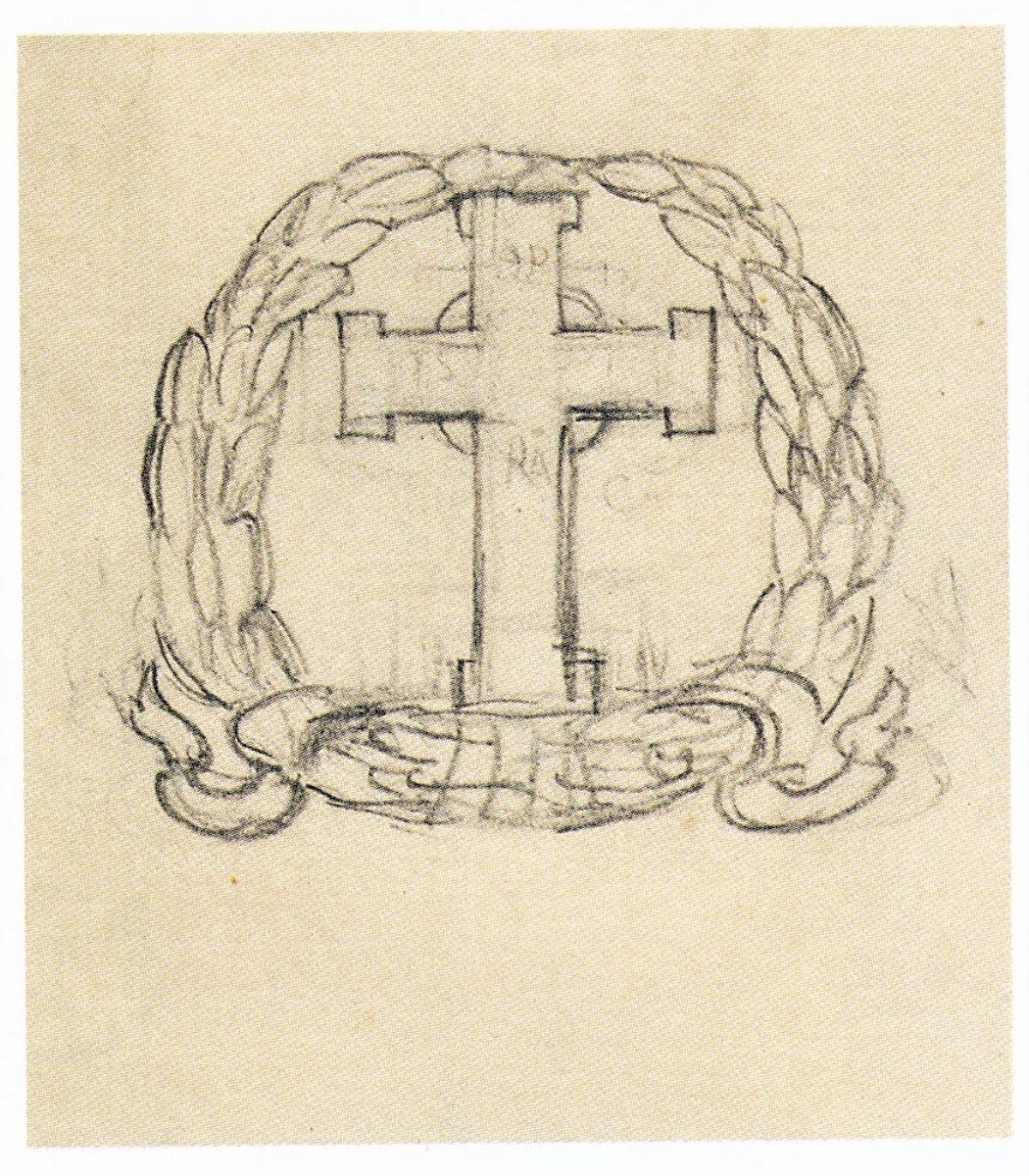 Descriere: Studiu de decorație realizată probabil în urma unei comenzi după primul Război Mondial. O cruce de top ortodox cu brațe egale este înconjurată de o ghirlandă de frunze de laur. La bază se încolăcește o filacteră. Desen esențializat, cu duct continuu și sinuos, cu accentuarea caligrafică a detaliilor.