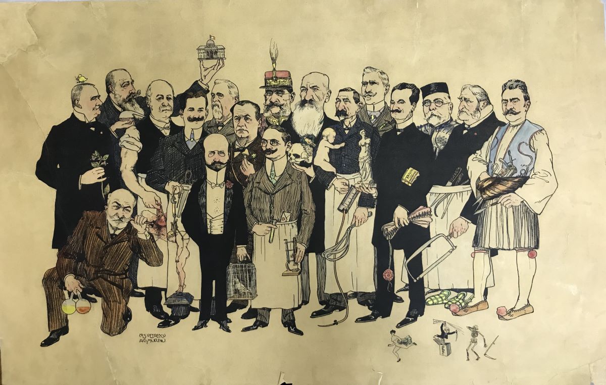 Descriere: Lucrarea înfățișează un grup compact de 17 personaje masculine, medici ai Facultăți de Medicină de la sfârșitul secolului XIX și începutul secolului XX, individualizați prin înzestrarea cu ustensile sau obiecte particulare ale ramurei medicale pe care o profesau. Grupul este centrat în jurul figurii lui Carol Davila, întemeietorul facultății, care apare în rândul din spate îmbrăcat în uniforma militară, cu chipiu cu bandă roșie. În jurul său sunt, conform descrieri din Furnica, „Măldărescu, Fl. Teodorescu, Istrate, Petrini Paul, Toma Ionescu, Obreja, Severeanu, Greceanu, Babeș, Demeostene, Șuțu, Drăghescu, Petrini – Galați, Gerota, Manolescu, Râmniceanu, Leonte.” În partea dreaptă a lucrării, sub compoziția cu medicii, se află redată o mică scenă cu o femeie dezbrăcată care fuge de moarte. Între ea și scheletul care poartă coasa, se află o cutie cu arcuri din care iese bustul unui medic cu un tub de acid fenic în mâna dreaptă, dezinfectant folosit în a doua jumătate a secolului XIX și prima jumătate a secolului XX, și un cuțit mare de bucătărie în cea stângă. Scheletul ,speriat de acțiunea acidului, își pierde echilibrul și coasa. În partea stângă, sub compoziție, sunt semnăturile celor doi autori cu tuș negru: N.S. PETRESCU / A.G. MURNU. Caricatura este dominată de culorile negru și alb, pe suprafețe foarte mici apărând culori precum albastru, roșu, galben sau verde.