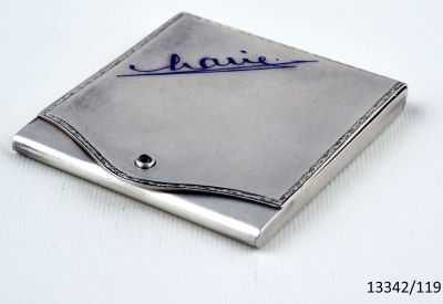 Descriere: Port-chibrit de formă dreptunghiulară, cu capacul în profil de arbaletă, prins în șarnieră, decorat pe marginea a trei laturi cu friză minusculă de entrelacs; buton de închidere circular, caboșon din safir sintetic. Pe capac, dispusă oblic inscripție cu email albastru cobalt „Marie”, iar pe muchie poansonul Sterlingsilver.