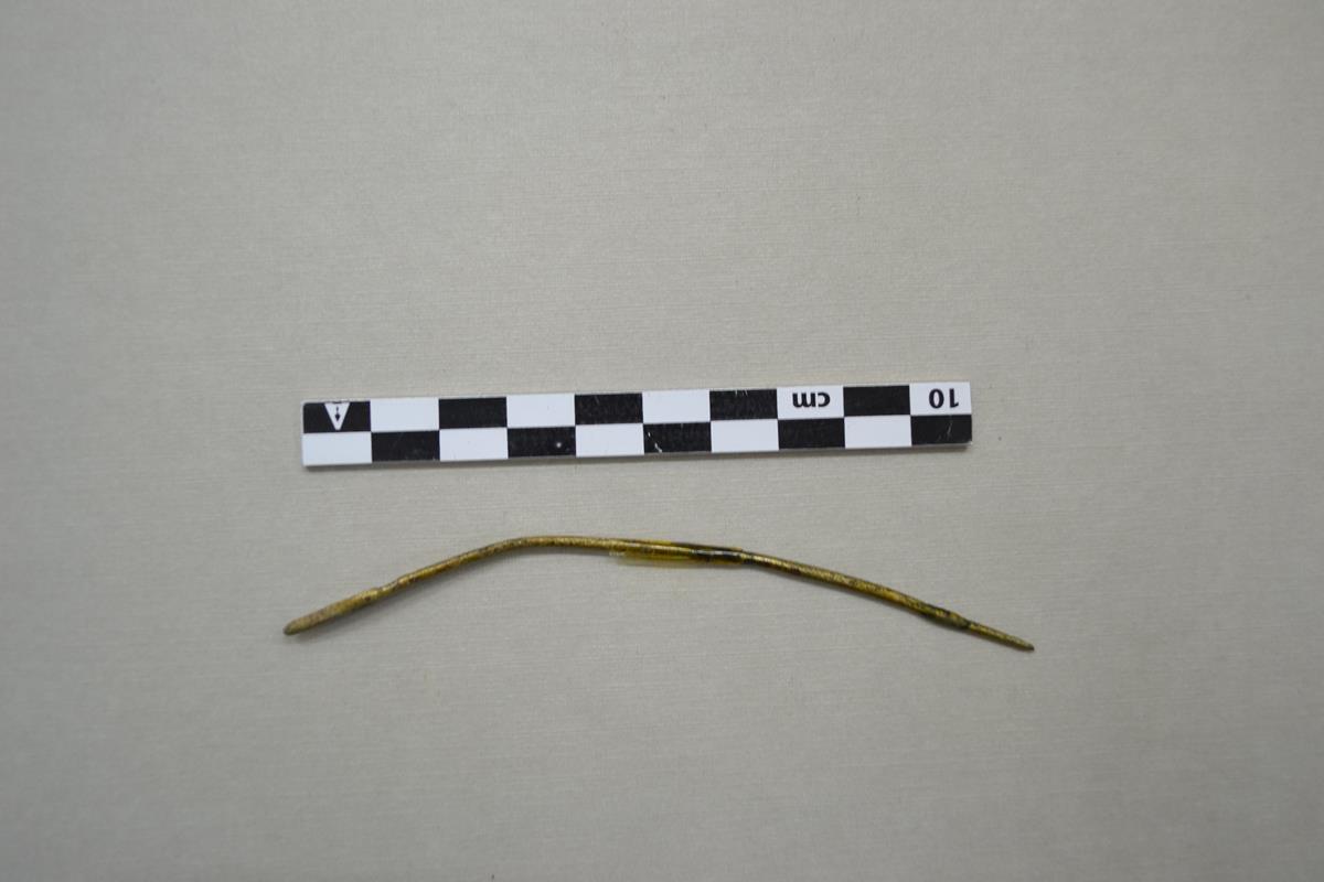 Descriere: Ac de cusut cu urechea perforată, de formă relativ ovală și cu partea superioară aplatizată și terminată în unghi ascuțit.Piesa prezintă o deformare mecanică pronunțată, încă din antichitate. Urme de uzură funcțională. Lipit cu rășină către vârf.