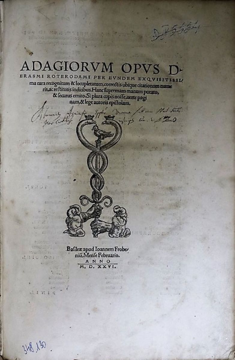 Descriere: Adagiorum opus D. Erasmi Roterodami: per eundem exqvisitissima cura recognitum et locupletatum, correctis ubique citationum numeris, ac restitutis indicibus. Hanc supremam manum putato, & securus emito. Si plura cupis nosse, uerte paginam, & lege autoris epistolam. Basileae Apud Ioannem Frobeniu[m], Mense Februario. Anno M. D. XXVI. [1526]
