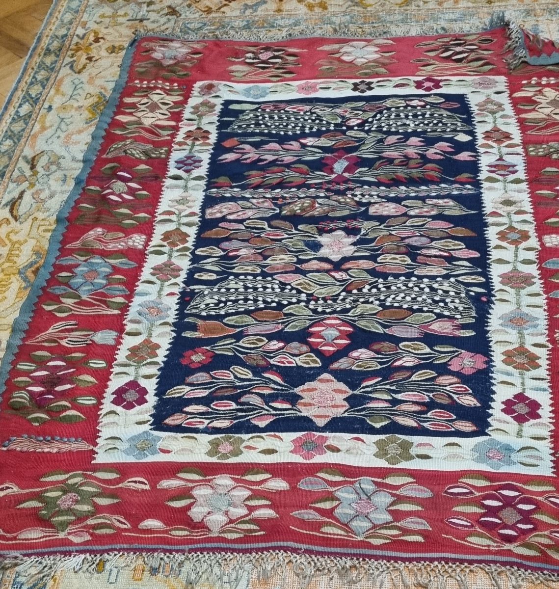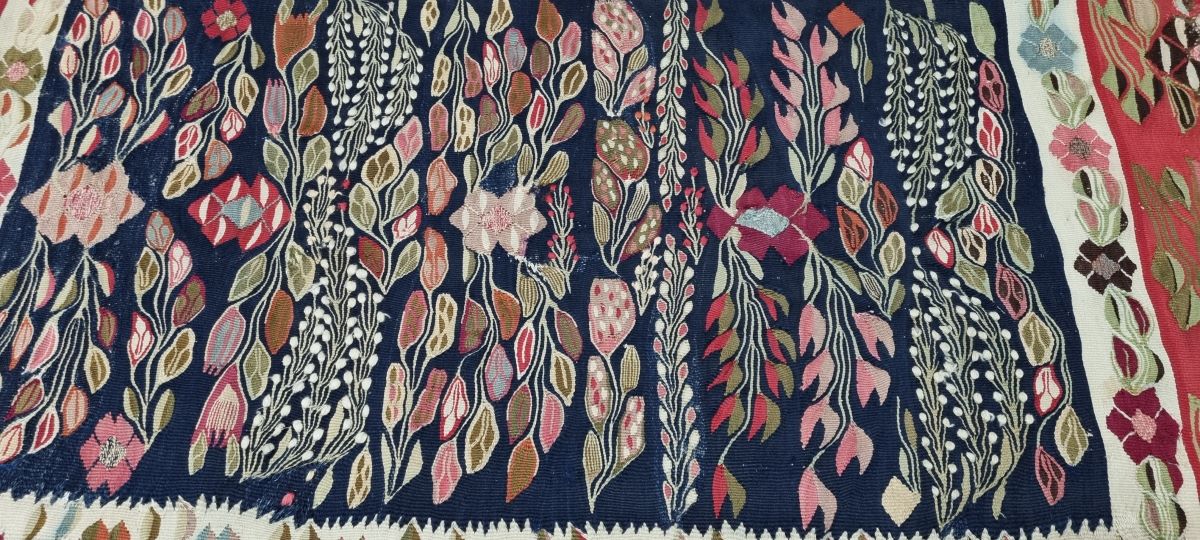 Descriere: Piesă de formă dreptunghiulară alcătuită dintr-o foaie, franjuri din fire de urzeală înnodate, cu motive decorative pe întreaga suprafață. Compoziție cu câmp albastru ultramarin, limitat de un chenar media sable și un chenar marginal – lat, roșu permanent, bordat pe toate laturile. Piesa este mărginită, pe laturile lungi, de dinți de fierăstrău. Ansamblul decorativ al câmpului, longitudinal și realizat prin alternanța ritmică, prezintă motive decorative vegetale și florale: crengi cu frunze, flori cu șase petale și crengi de mărgăritar. Chenarul sable este ales cu ghirlande formate din flori policrome cu șase petale, pe laturile lungi și linii simple pe cele scurte. Chenarul roșu este decorat cu buchete alcătuite din nalbe înconjurate de frunze în alternanță cu crenguțe de mărgăritar. Gama cromatică vie, diversificată, de mare rafinament decorativ: ultramarin, roșu permanent, sable, siena natural, verde crom, galben crom, violaceu, brun și roșu.
