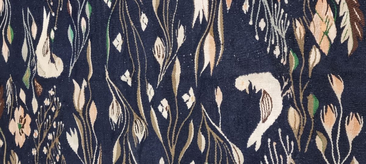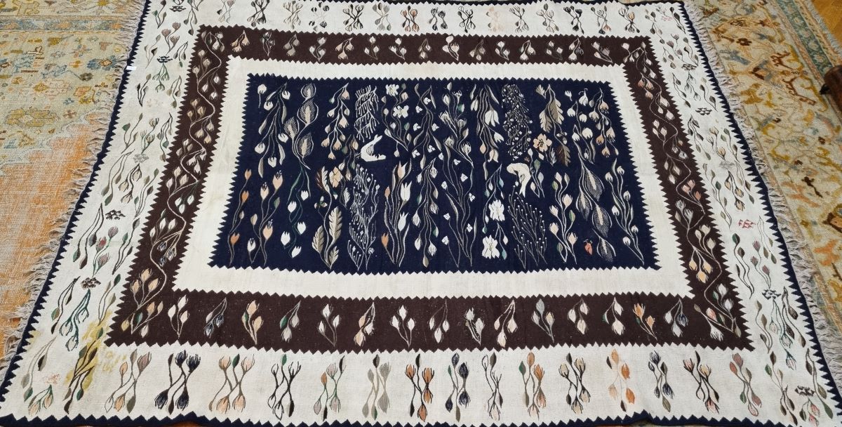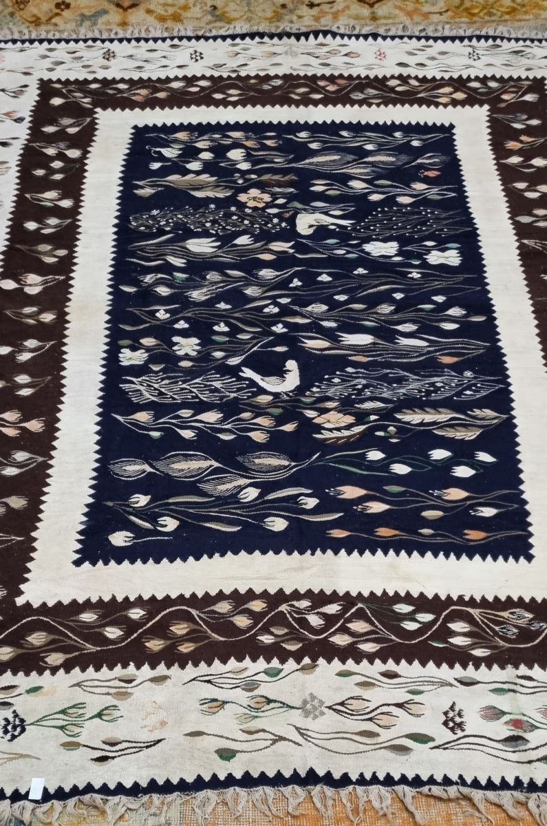 Descriere: Compoziție închisă în triplu chenar, cel exterior, pe fond crem, este mărginit cu dinți de fierăstrău, cu o succesiune de motive florale alese (crenguțe cu flori și boboci de floare), al doilea, pe fond brun, este ales cu crenguțe cu boboci de floare. Chenarul de lângă câmpul central, cu fondul crem, prezintă zigzaguri. Ansamblul decorativ al câmpului, realizat pe fond bleumarin, este decorat motive avimorfe, ramuri cu frunze și flori, șiruri policrome de ramuri cu frunze și flori mărgărint dispuse orizontal. Gamă cromatică cu spectru serios și cumpătat: bleumarin, urmat de brun, alb, negru, siena arsă, galben crom, verde crom, roz pudrat.