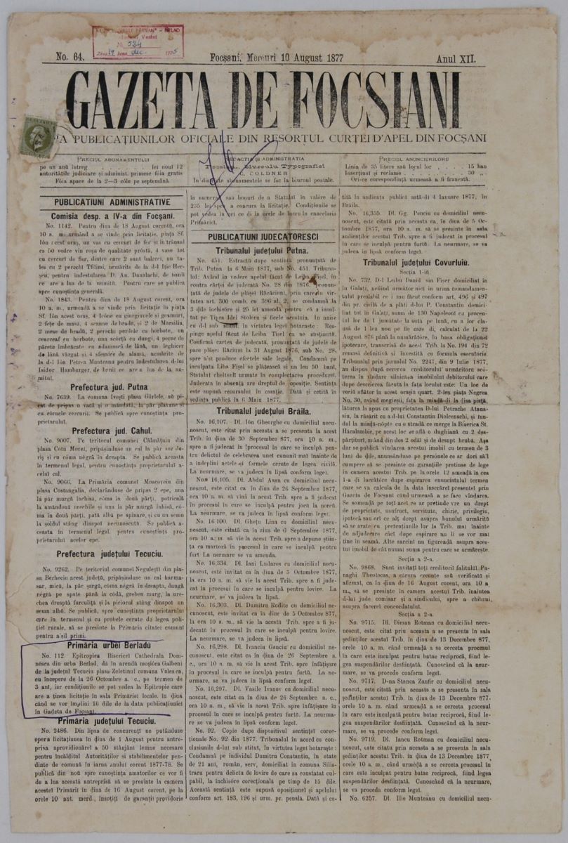 Descriere: Numărul 64 al acestei gazete, apărut miercuri, 10 august 1877 (Anul XII), la Tipografia C. Coldner, conține patru pagini nenumerotate, în care sunt articole legate de „Publicațiuni administrative” și „Publicațiuni judecătoresci”. Acestea reflectă situații pe linie administrativă sau judecătorească, din mai multe județe din țară: Putna, Cahul, Tecuci, Brăila, Covurlui, Ismail, Râmnicu-Sărat. În colțul din stânga, sus, este aplicat un timbru poștal și ștampilă, foarte puțin vizibilă. De asemenea, în zona de mijloc, este scris cu pix albastru numărul „76”. Publicația de față devine importantă nu doar din perspectiva istoriei presei în Moldova (erau 40 de ani de la apariția primelor publicații în limba română), dar și din perspectiva memorialisticii administrativ-judecătorești, gazeta furnizându-ne informații care ne duc cu gândul la Legea organizării administrativ-teritoriale, prin Decretul domnesc 495/1862, dat de Al. I. Cuza, precum și Legea 396/1864, care propunea ca unitatea de bază adminitrativ-teritorială să devină județul. De aceea, găsim în gazetă județele: Brăila, Tecuci, Covurlui, Râmnicu-Sărat etc., dar și județe precum Putna, Cahul și Ismail, care au trecut la ruși, după încheierea Războiului de Independență. Deși publicația nu face parte dintr-o colecție întreagă, valoarea ei devine cu atât mai mare, cu cât circulația gazetei și exemplarele rămase peste timp sunt mai rare.
