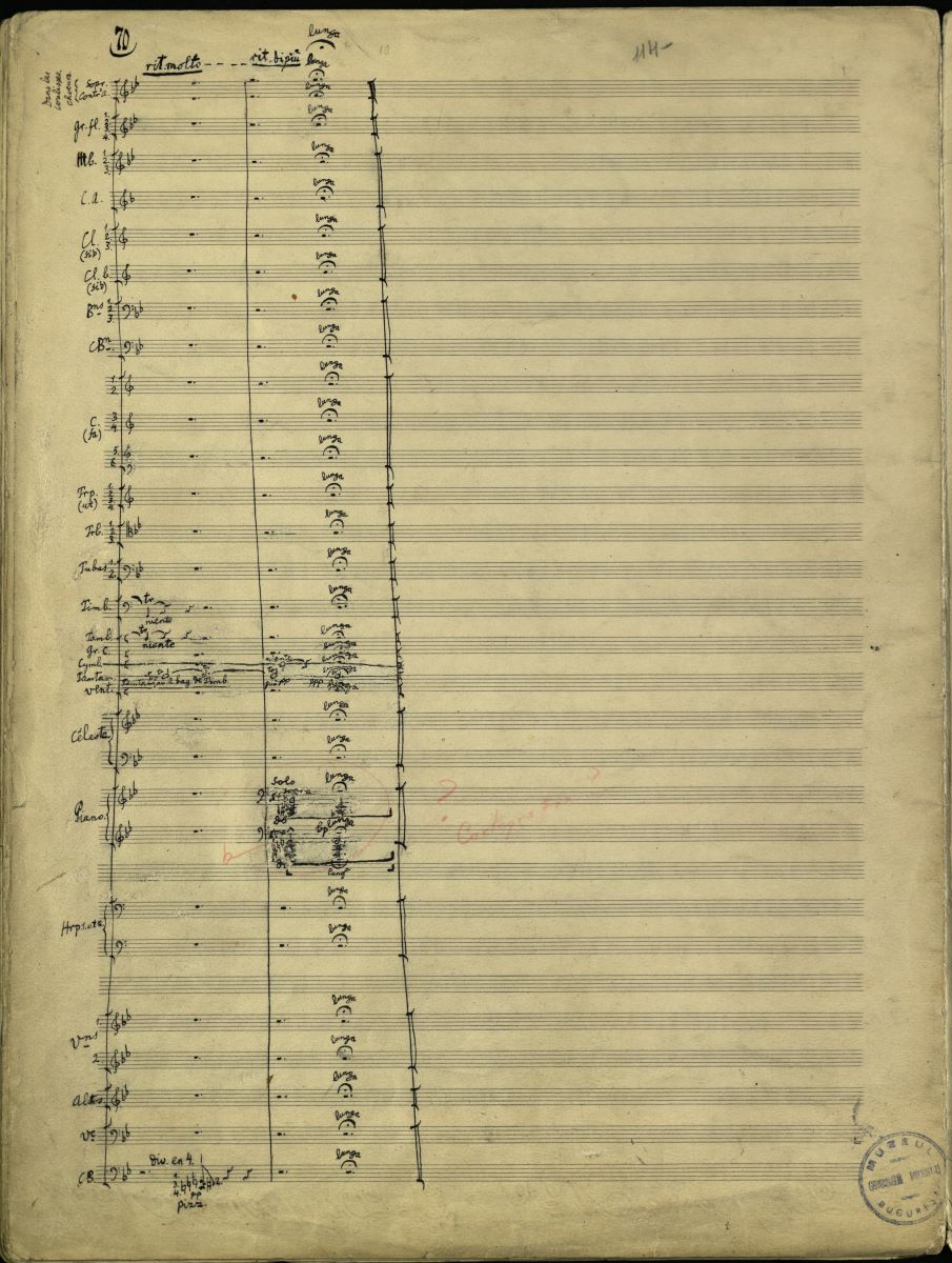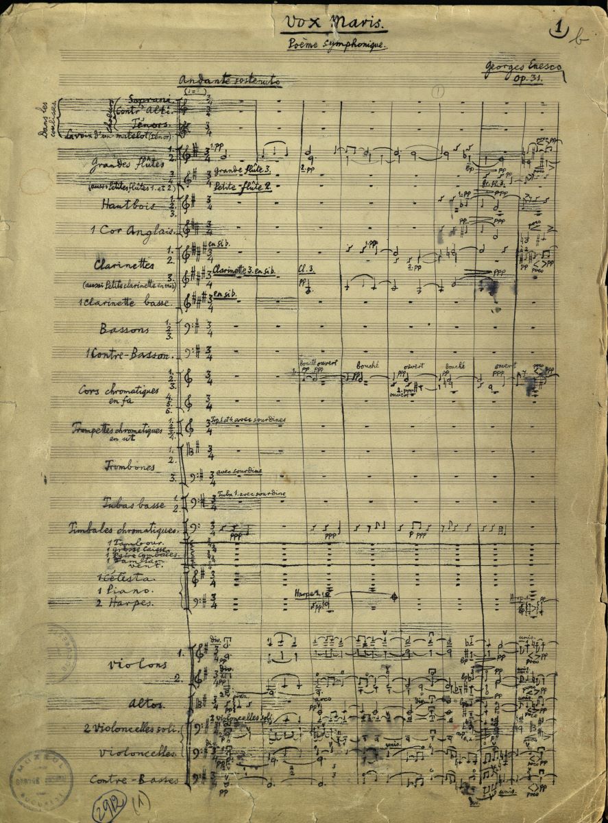Descriere: Manuscris muzical complet aparținând compozitorului George Enescu, intitulat ”Vox Maris. Poème symphonique”, op. 31. Este alcătuit din 70 de file a câte 30 de portative, scrise doar pe o parte, numerotate de autor de la 1-70. Pe prima filă, titlul este scris central, subliniat, deasupra primului portativ. Numele autorului precum și mențiunea ”op. 31” sunt trecute în partea dreapta-sus (pe primele două portative), subliniate. Toate filele sunt completate cu cerneală neagră. Pe prima pagină sunt trecute instrumentele din orchestră precum și indicația agogică ”Andante sostenuto”. Lipsește indicația de metronom (în paranteza rotundă de sub indicația de mișcare, nu este menționată valoarea pătrimii. Acest tip de indicații lipsesc pe tot parcursul partiturii). Tenorul - vocea matelotului (cu versuri notate atât în dialect breton, cât și în limba franceză, autoare Renée Willy - după cum menționează G. Enescu în josul pagini, subliniat) apare pe pagina nr. 9, odată cu indicația ”Senza rigore. A tempo. Tranquillo” - plasată central, deasupra primului portativ. Manuscrisul este complet, orchestrat, finit, se încheie la pag. 70.