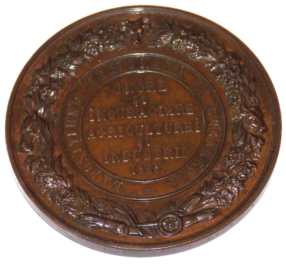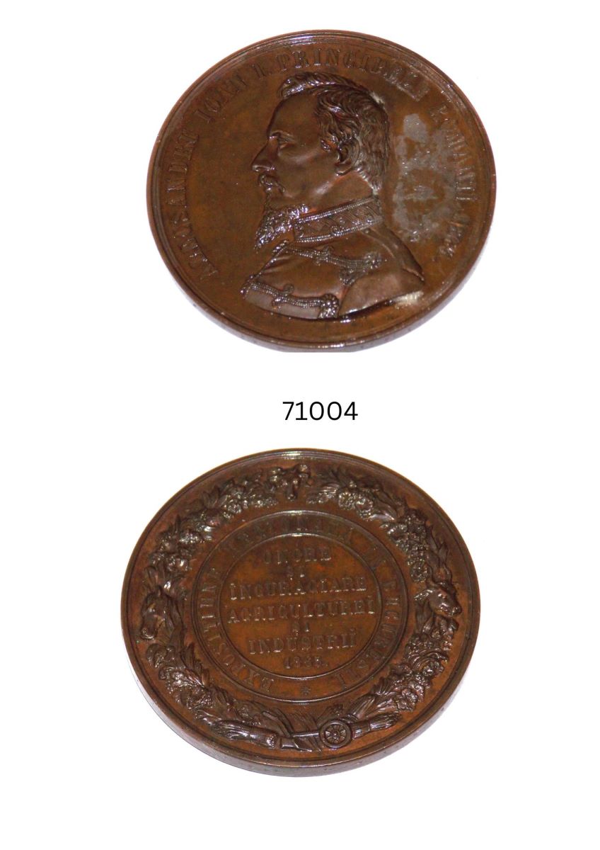 Legendă revers: central: : ONÓRE / ȘI / ÎNCURAGIARE / AGRICULTUREI / ȘI / INDUSTRII / 1864; în jur, între două cercuri liniare: EXPOSIȚIUNE REGIONALĂ ÎN BUCUREȘTI