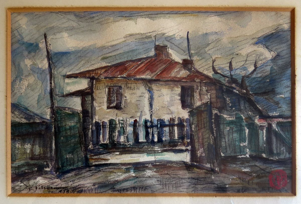 Descriere: Lucrarea realizată în desen cu cărbune și laviuri în acuarelă, redă casa parohială din Târgoviște. Compoziția foarte bine echilibrată, riguroasă, susținută grafic de verticalele stâlpilor este foarte bine completată de diagonalele acoperișului casei care imprimă desenului dinamica deosebită. Cromatica în albastruri specifice maestrului au o transparență deosebită, iar accentul de roșu cărămiziu al acoperișului este pus în valoare de albul pereților, calitățile plastice ale lucrării fiind de mare rafinament. Semnat și datat stânga jos cu negru: G. PETRASCU 1934.