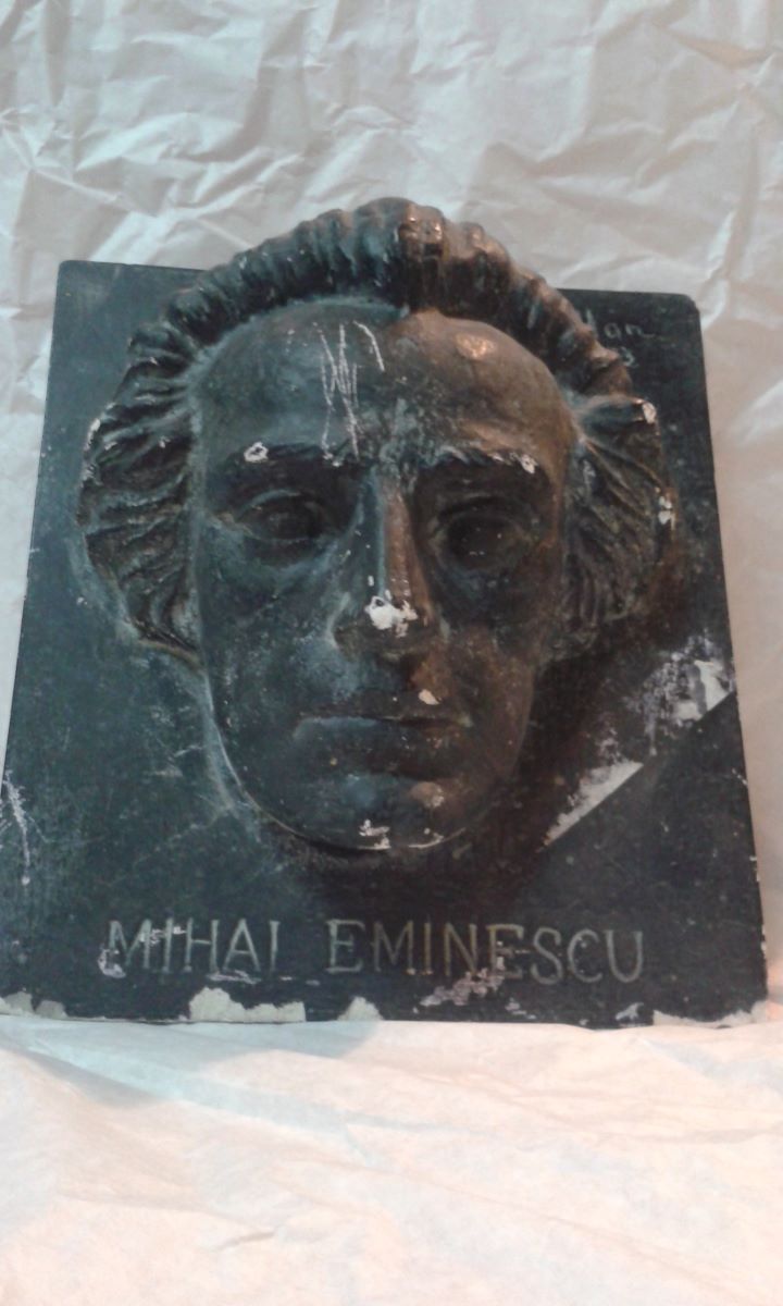 Descriere: Poetul lui Mihai Eminescu văzut din față. Plinta ce susține relieful este realizată la un unghi de 120 de grade de sol. Deși trăsăturile generale ale poetului trimit la scriitor, există o mare asemănare și cu portretul sculptorului: păr bogat, frunte lată, nas drept, ochii doar schițați, fața cu obraji supți, bărbia accentuată. La baza plintei este scris cu majuscule numele scriitorului: MIHAI EMINESCU.